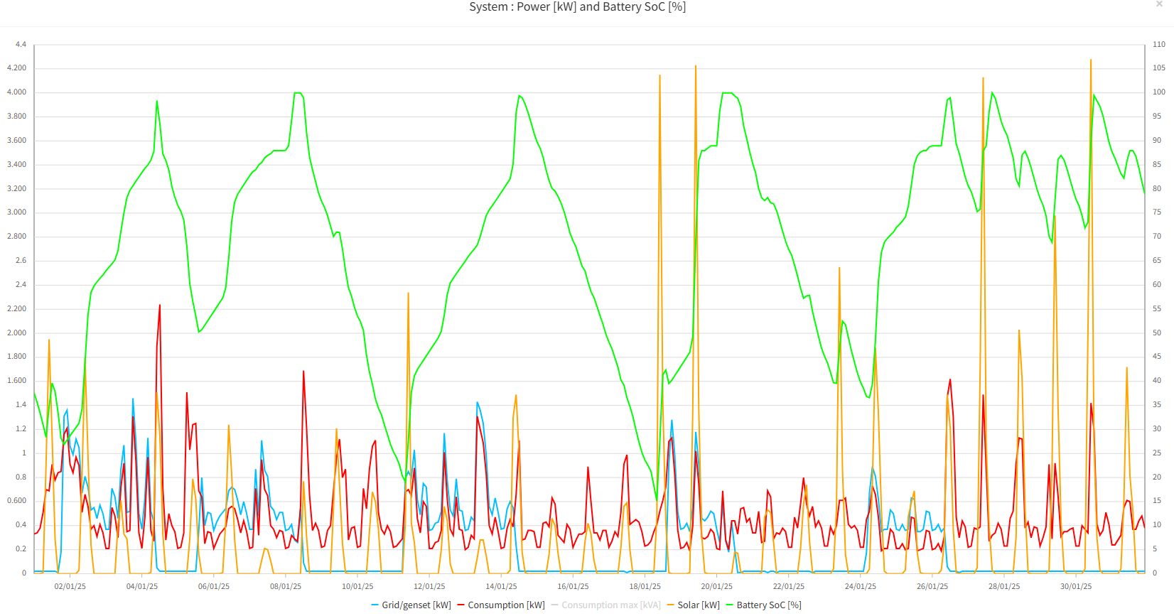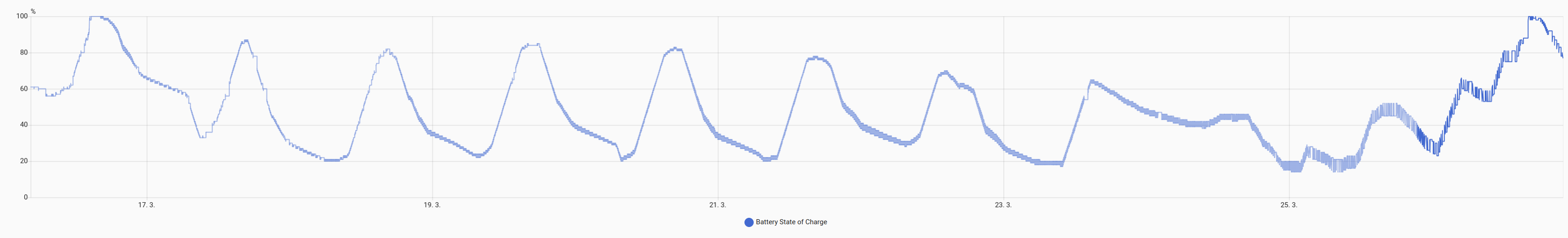 Ak mas menic s malou spotrebou a prepanelovanie, pri vybiti pod 20(15) treba dobit na 100(80) kvoli top-balancingu. Zimna prevadzka baterky potom vyzera takto (JANUAR 2025) -najdolezitejsi udaj je zeleny graf->SOC baterky. Druha moznost je v case, ked doma nie som a snezi a je december/januar dom prepnut na distribuciu a nechat FVE sa dobit (trva to kludne aj tyzden).Potom energiu za 1-2 dni minut a cyklus zopakovat.