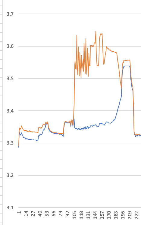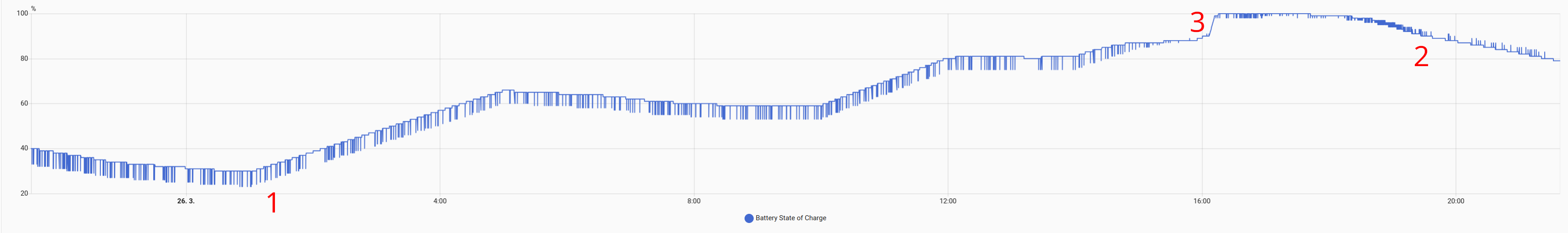 Po 10 dnech, co baterie nebyly nabity na 100%, tak se mi rozdíl SOC obou skupin postupně navyšoval a dnes ráno se už lišil o 7% (bod 1). Po nabití na 100% byl rozdíl 2% (bod 2). Když už tady diskutujeme nabíjení, poslední rok, to jsem ještě provozoval pouze původní 2 ks US2000B (SOH 93%) jsem pozoroval nelineární nabíjecí charakteristiku mezi 88%-100%. Je to takový hup, kdy to vypadá že se nenabíjí a pak to rychle vyroste k těm 100%, při stejném nabíjecím proudu. Tento jev mi nyní vykazuje i všech těch 14 baterií (oblast 3). Nevím, jestli je to problém baterií, nebo měření střídače GoodWe. Z toho grafu mi spíše vyplývá, že by to měl být problém jen té jedné skupiny (rozdíl v SOC obou skupin se v té oblasti lineárně zmenšuje až k 0 rozdílu).
