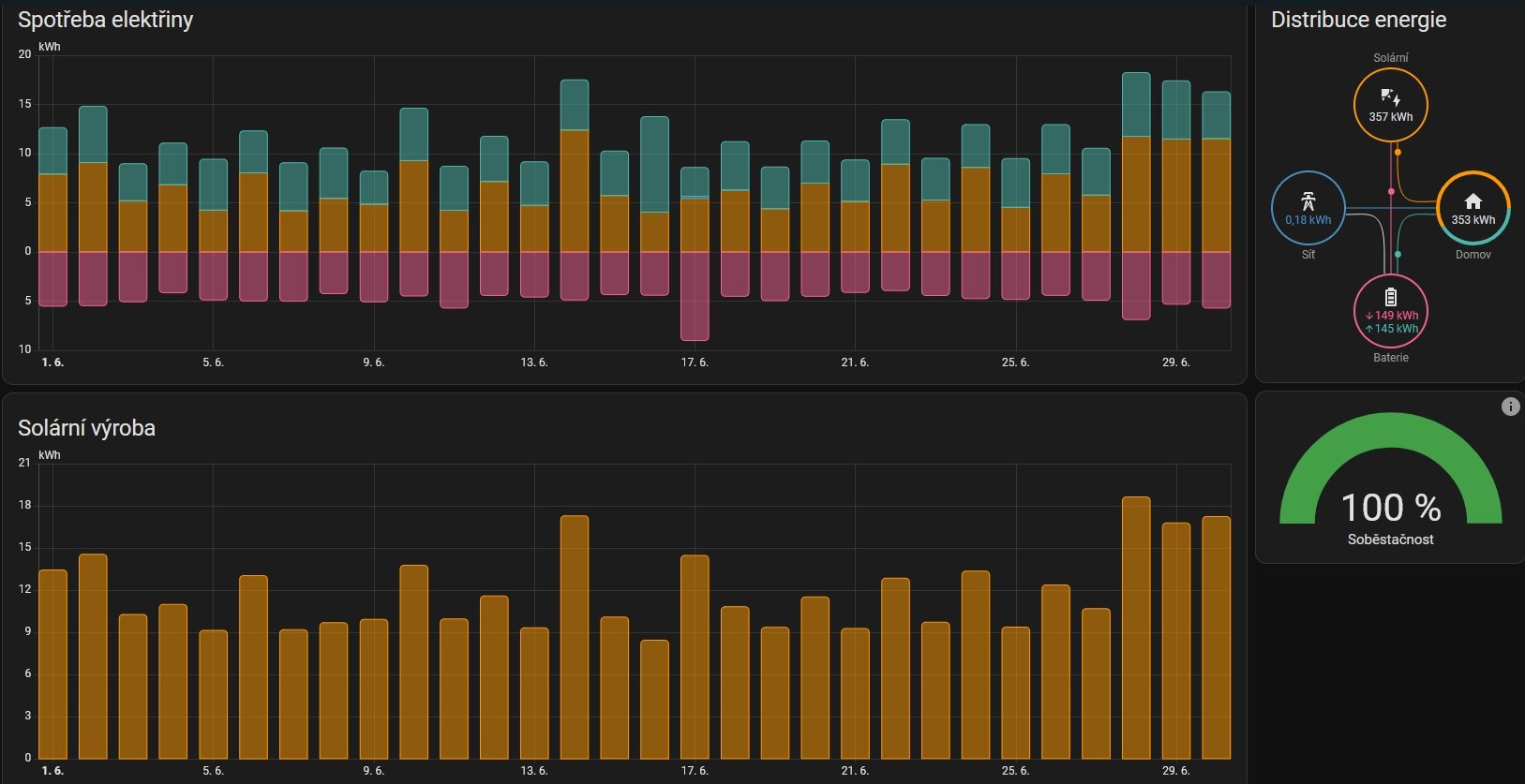 Protože v červnu už logicky nebylo třeba přitápět, tak nám spotřeba elektřiny (a tím i výroba) trochu poklesla. Asi by to chtělo doplnit nějaké el. spotřebiče.
