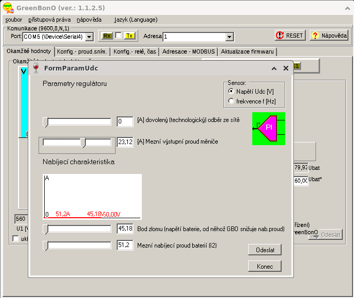 Jen jsem svorku AI3 pro snímání DC proudu akumulátoru propojil se svorkou Vcc/2 a svorku AI2 pro měření napětí akumulátoru jsem připojil na pin 5V. Tím si GreenBonO "myslí" že je akumulátor nabitý a vytěžuje do maximálního nastaveného proudu "měniče" v tomto případě je měřen přívod do domu od elektroměru takže jističe.