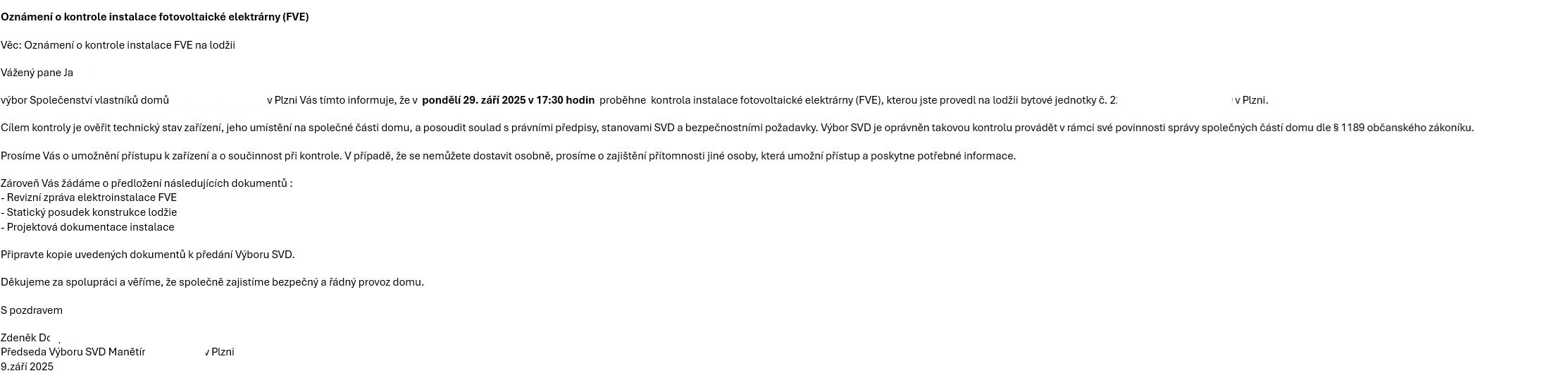 Informoval jsem o tomto zameru nase SVJ, poslal jsem jim veskere informace co si tam chci dat tech. parametry a vahu, SVJ mi odpovedelo, ze s tim problem nemaji, ale zalezi na ostatnich clenech SVJ, nastesti jsme meli cca za dva tydny vyrocni schuzi clenu SVJ, kde se o tomto zameru nechalo hlasovat. Vetsina nebyla proti a byl mi udelen souhlas s instalaci.