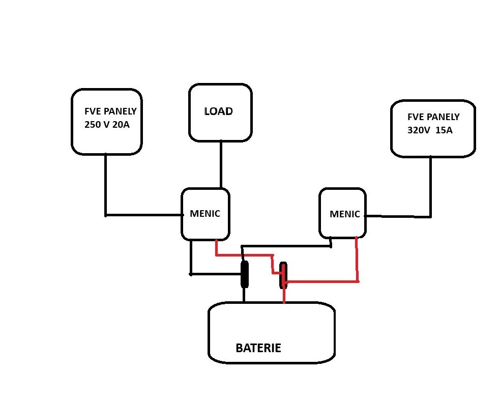 Můj plán je postavit solární přístřešek na dvě auta. A otázka zní. Mohu použít druhý stejný měnič a připojit jej paralelně jen jako nabíječku baterie, bez připojení k zátěži. Jen abych posílil zimní výrobu. Pro pochopení jsem nakreslil jednoduché schema, pro jednoduchost jsem samozřejmě vynechal jištění baterie, panelů...