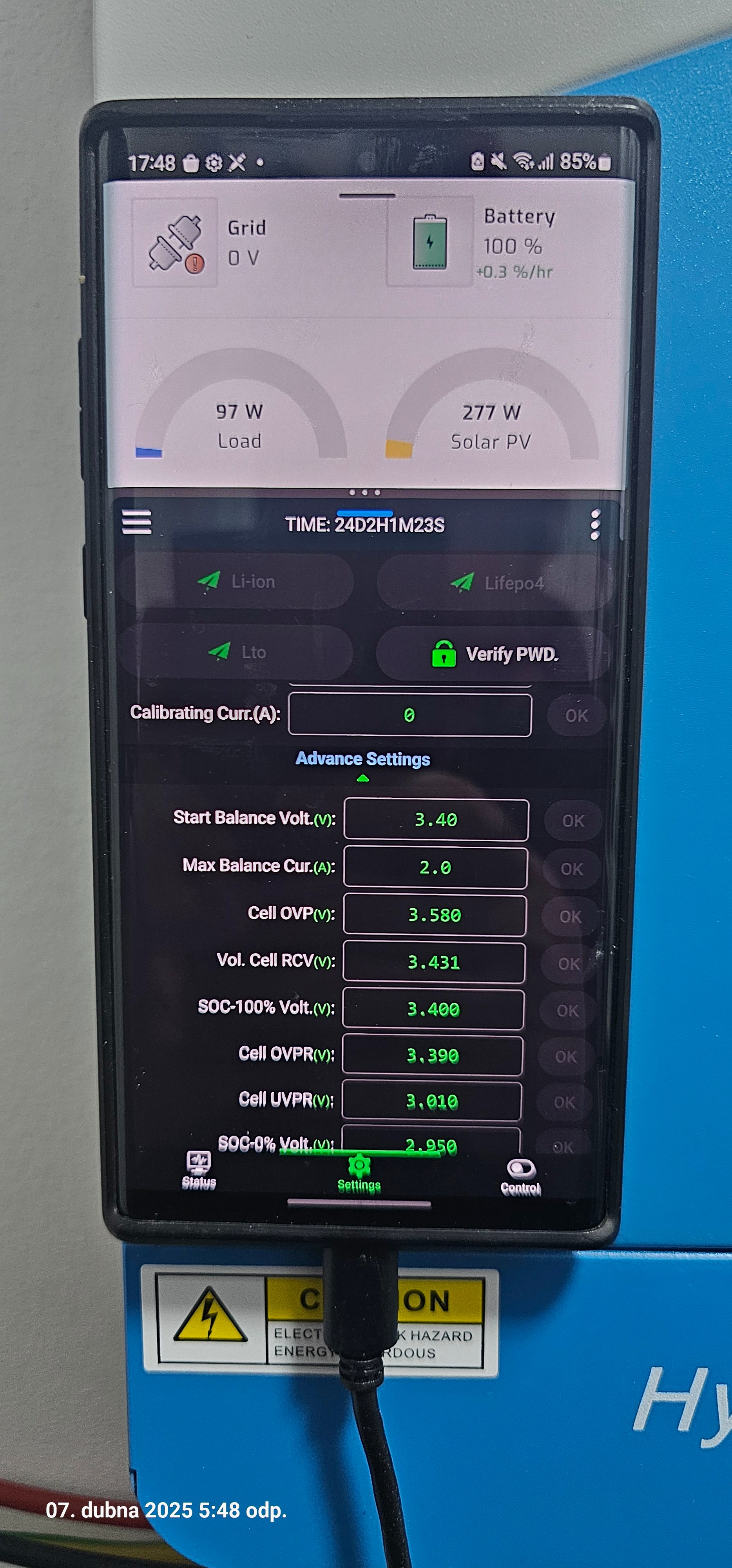 Baterky jsou Eve 280 AH ale nabíjim je max 80 A (nataveno na měniči) takže ještě méně jak 0,5C. V případě dvou měničů nastaveno max 50A na každém...