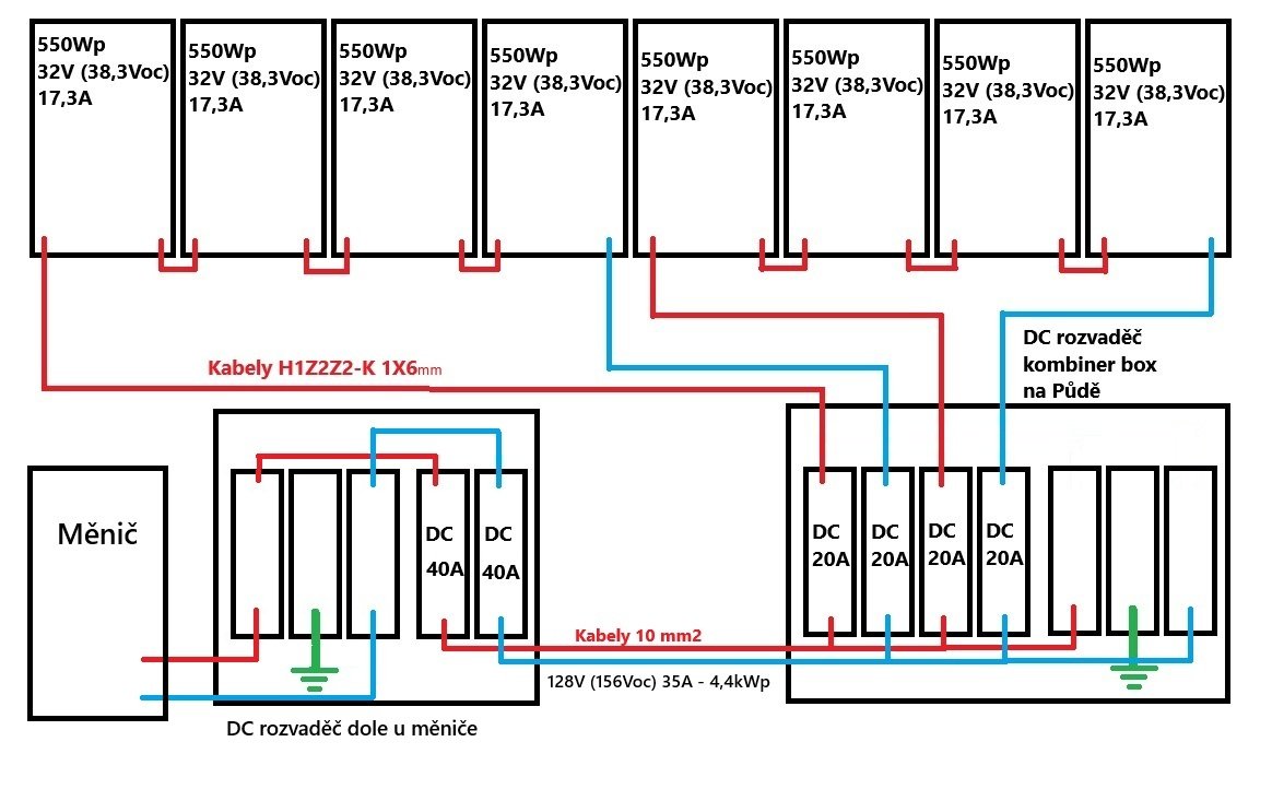 Jde mi o to abych správně zvolil průřez kabelu a připravil DC rozvaděč na půdě na obě varianty a nemusel v budoucnu měnit zapojení na střeše u panelů.
