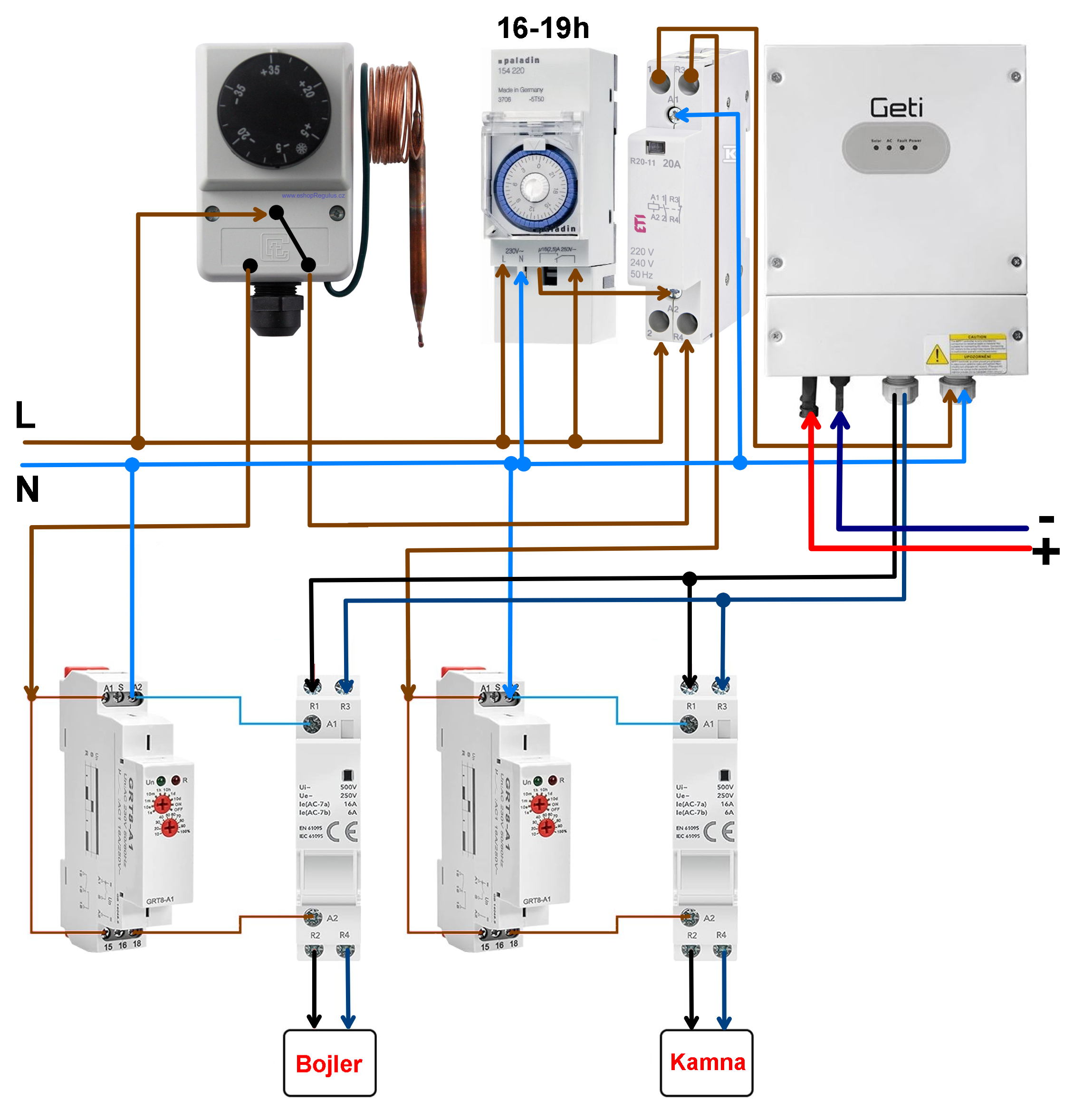 Zpět jsem opožďovat nepotřeboval, tedy tam je to relé jen jedno, u Tebe bych volil 2ks - jedno na bojler a jedno na kamna.