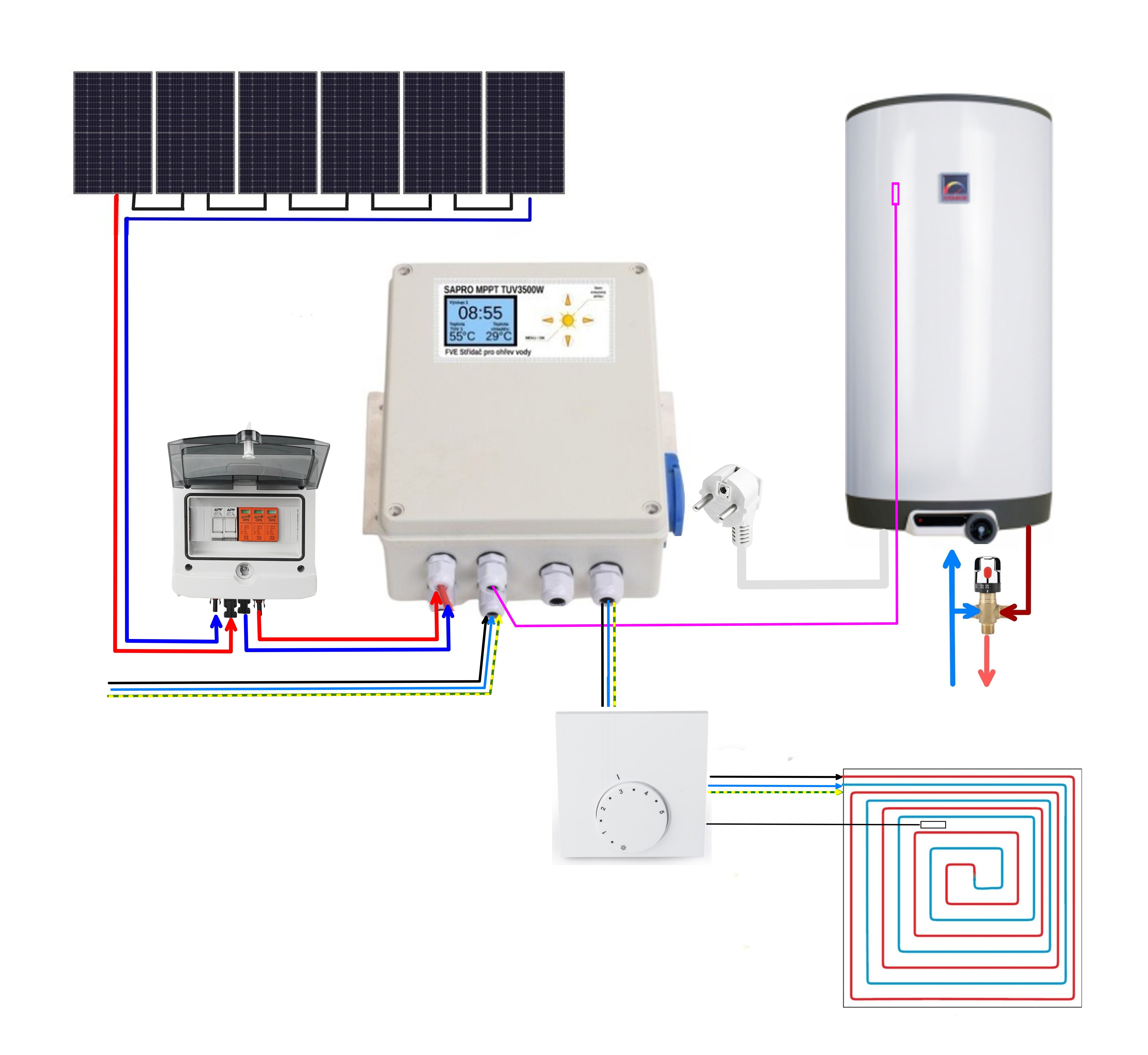 Z přepínacího kontaktu toho doplněného provozního termostatu si dovedeš šťávu do té podlahovky. Jen teda pro pořádek, jestli máš podlahovku i ve sprcháči, tak tam potřebuješ spešl chránič, ony ty "TUV" měniče nedávají sinus, ale obdélník, a to obyčejný chránič nedá.