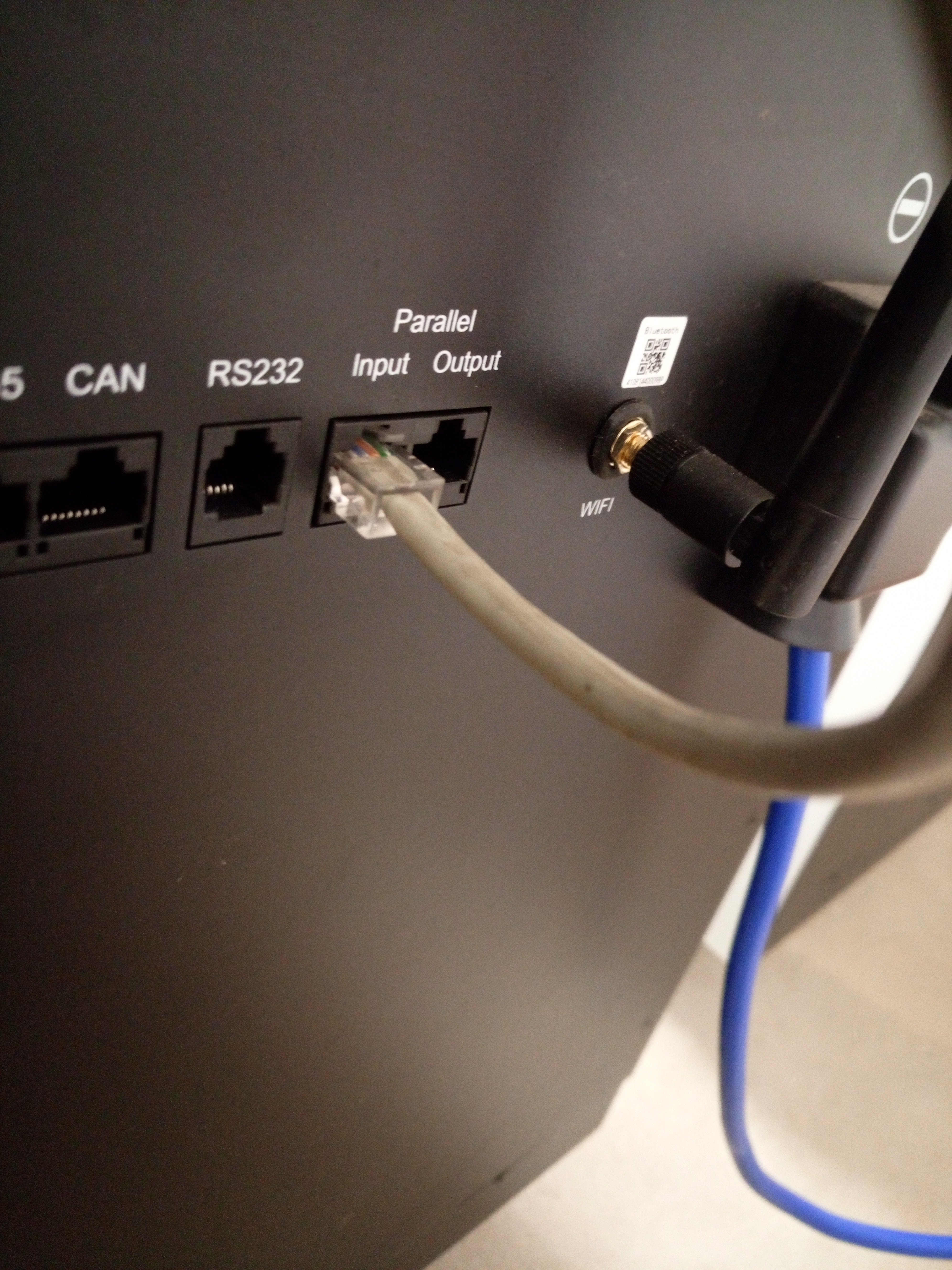 Diskuze se zaměřuje na konektory baterie Must LP2000, zejména na paralelní připojení pomocí rovného RJ45 kabelu a komunikaci přes CAN linku. Uživatelé sdílejí fotografie a technické poznatky o zapojení pinů a signálů, včetně odporu a funkčnosti RS485. Cílem je lepší pochopení správného zapojení a provozu baterie v paralelním režimu.