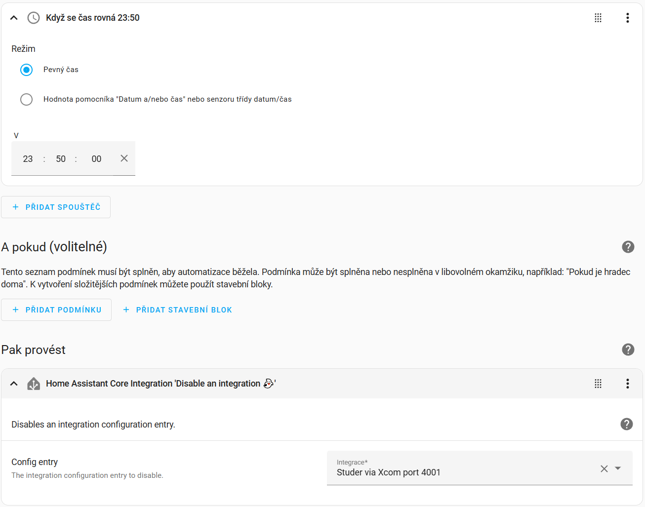 Tak jsem přišel na to jak o půlnoci vypnout a zapnout komunikaci mezi HA a XCOM aby fungovalo odesílání dat na portál Studer . Stáhnul jsem si do HA integraci Spook .Ta dokáže přes automatizaci v HA vypnout a zapnout integraci Studer jak potřebujete. Samotný HA neumí vypnout ale hlavně zapnout integrace tak se musí použít Spook. Já jsem tedy jiný způsob nenašel. Možná se to někomu bude hodit.