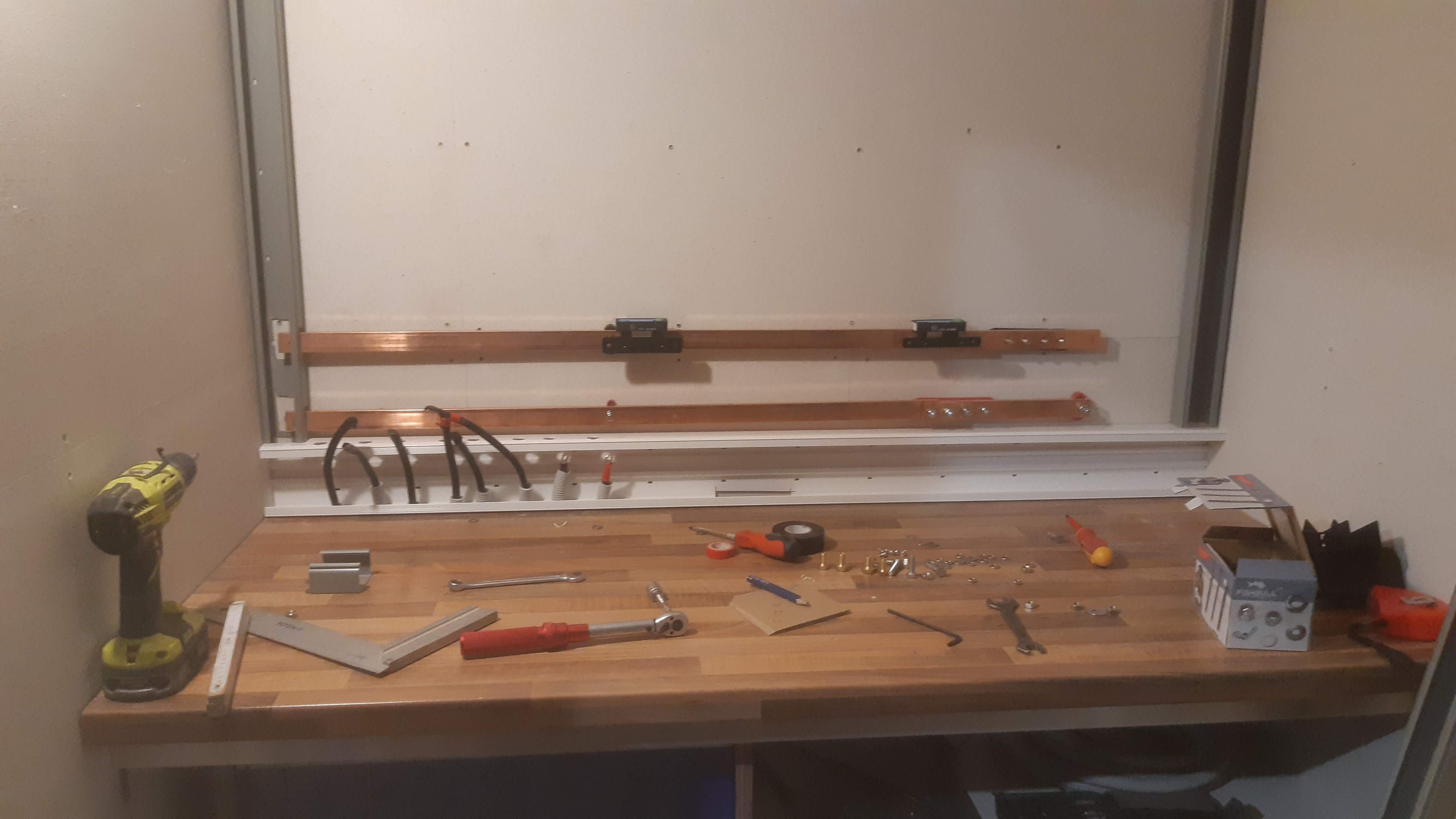 Směrem do prava pak budou ve žlabu i s SHUNT a zas odpínače pro MPPT - a zase SHUNT ve žlabu. Bohužel mám těch na pásovinu málo, ještě to promyslím s těmi BEZ... jestli je nepřivrtám navrch na CU profil - taky.