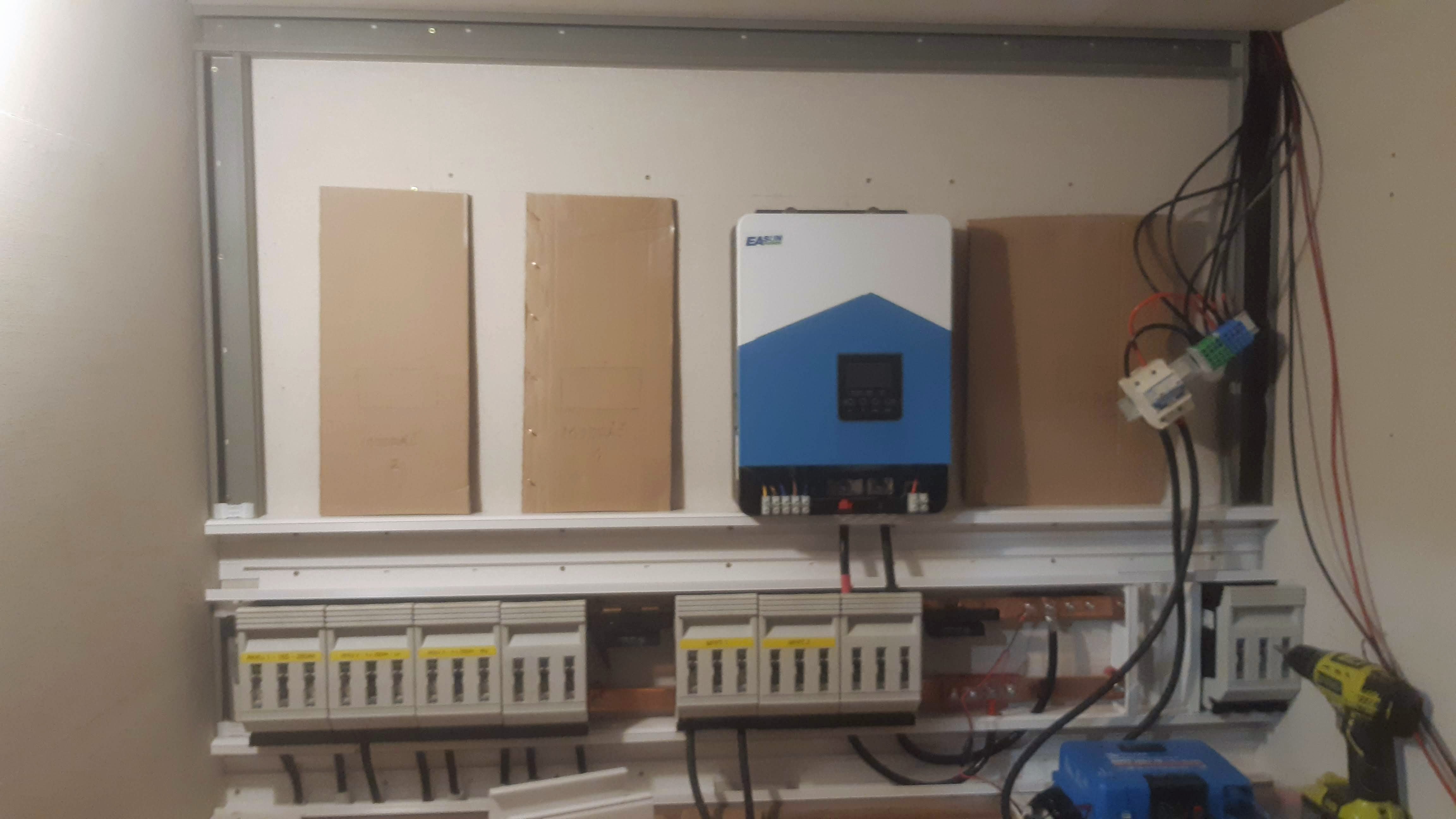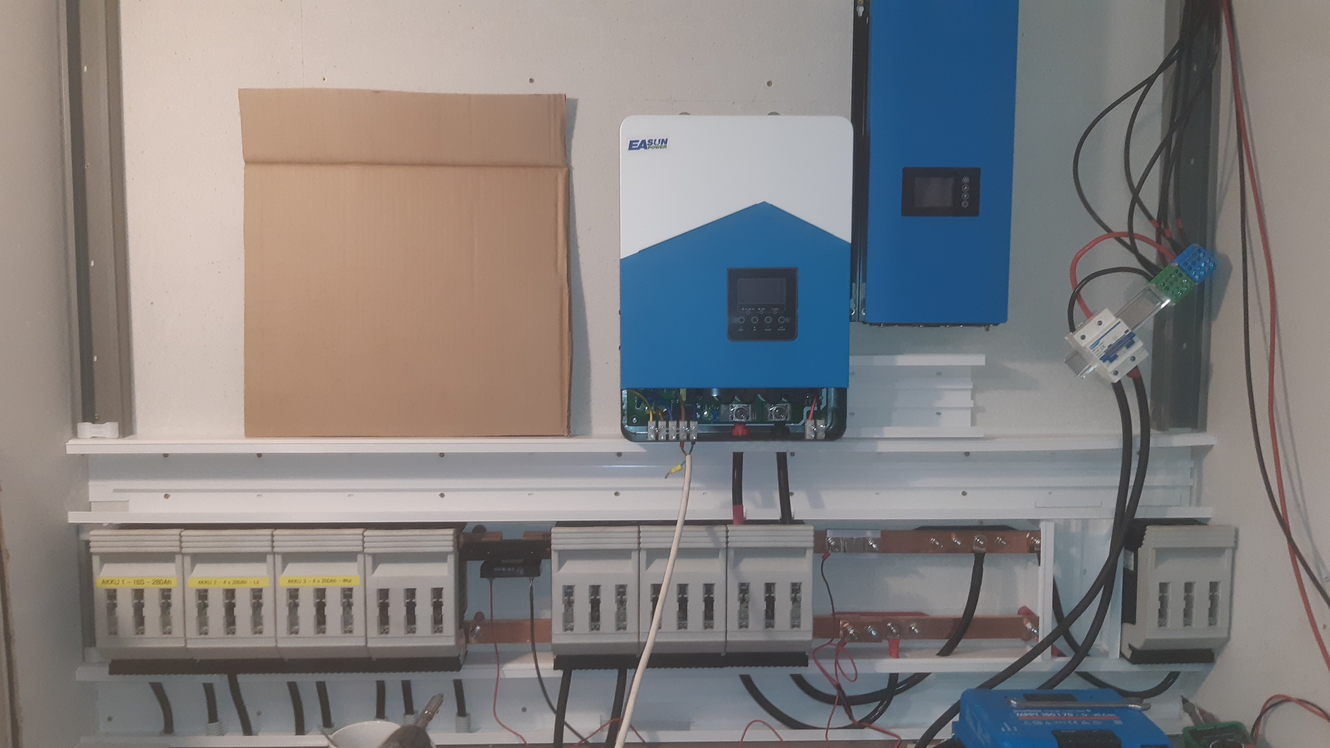 Vlevo by se měli vejít dva Modráčci nafázované na výstup měniče a v pravo záložní měnič, kdyby se odporoučel tento laciný kousek Easun 6kW.