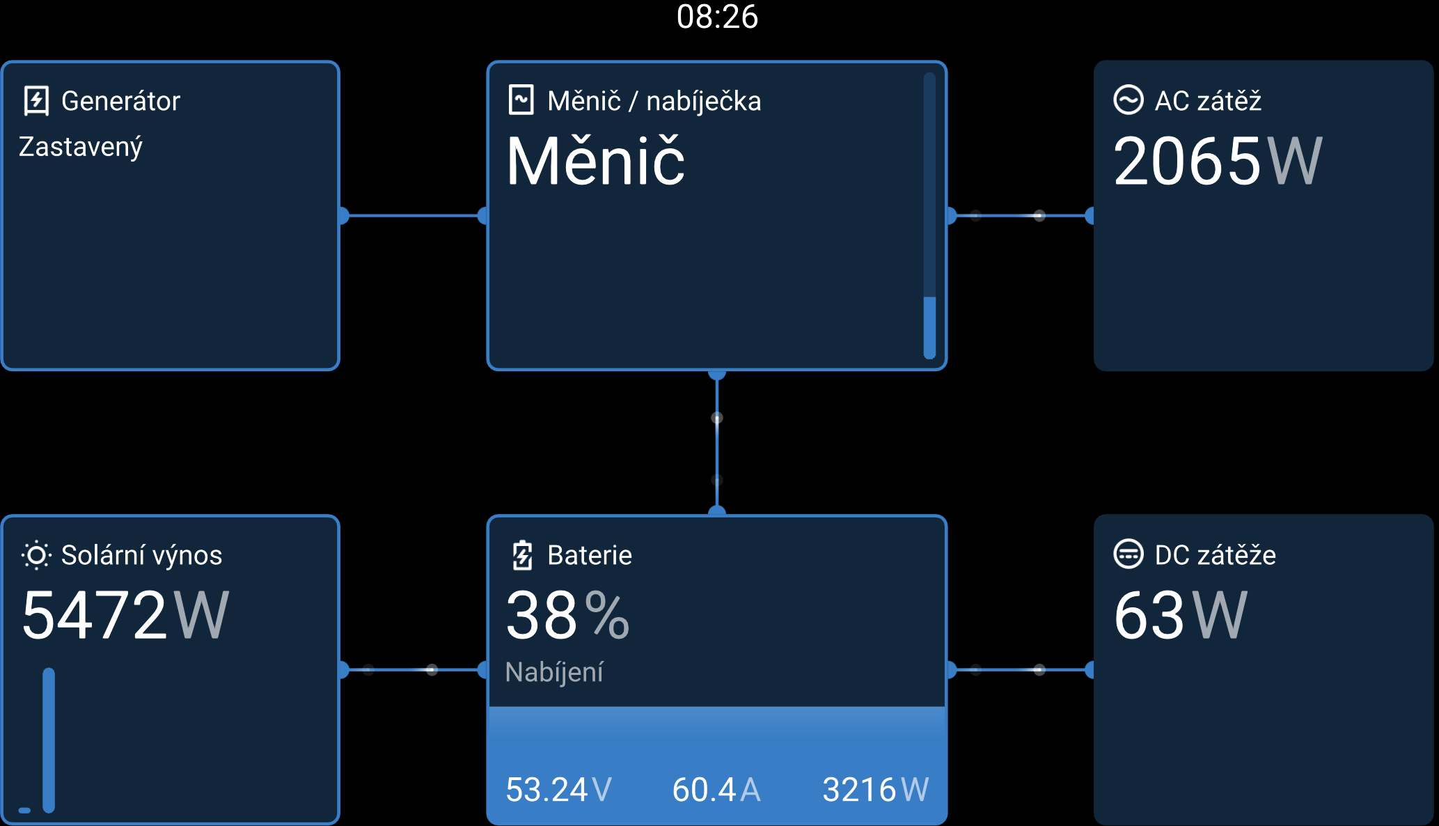 Pokud jsme DC spotřebu vypnuly, zobrazuje se pouze vypočítaný rozdíl mezi baterkou a MPPT, taky se tam pohybuje modré zobrazení, že to tam teče, ale kolik se nám tam nepodařilo dostat. (ani mě pak samotnému na další 20 pokusů...)