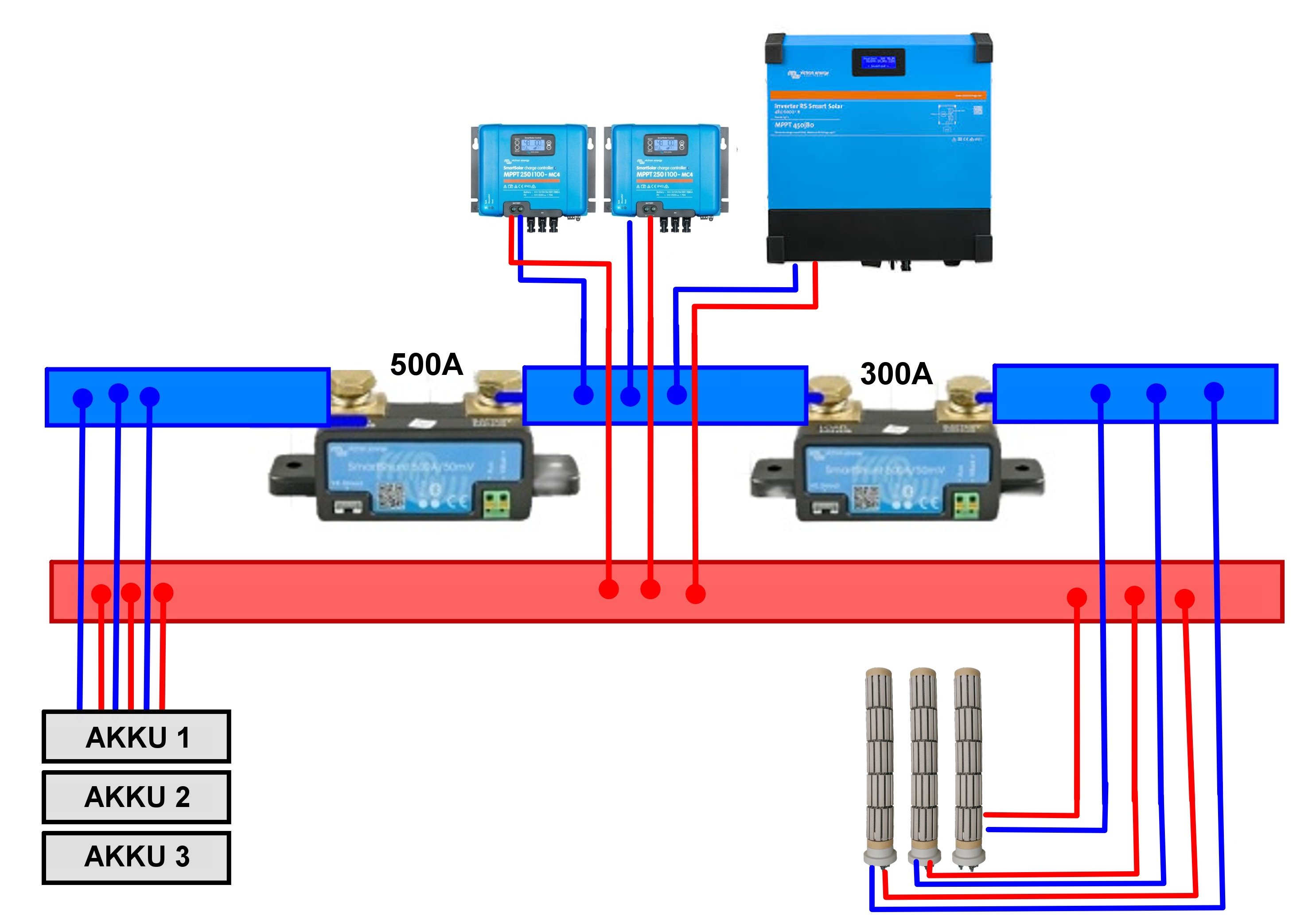 Edit 2 : Respektive tam chybí ještě ten Modráč - který by mohl být - pokud to jde - jako DC spotřeba a zapojený tak jak je na obrázku, nebo ho připojit až za Shunt 300A - pokud to jinak nepůjde...