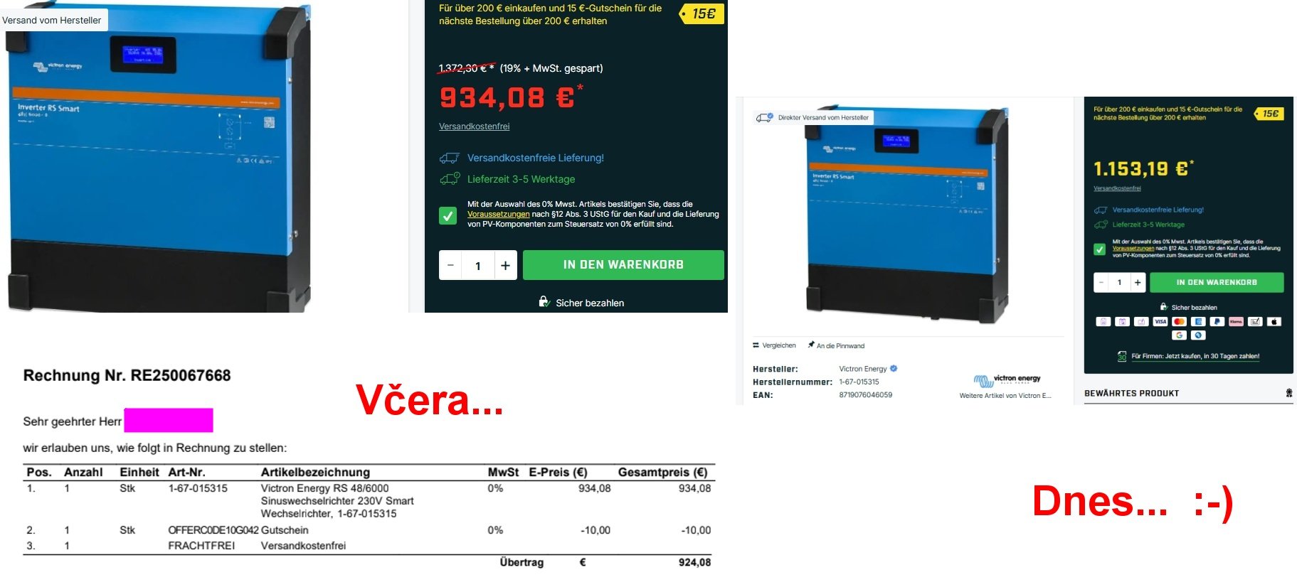Při počítání MP2 5000 + MPPT 1 + MPPT2 od Victron jsem došel k velmi významnému rozdílu v ceně, oproti RS 48/6000 který jsem koupil za 934 Euro a už má 2 x MPPT v sobě.