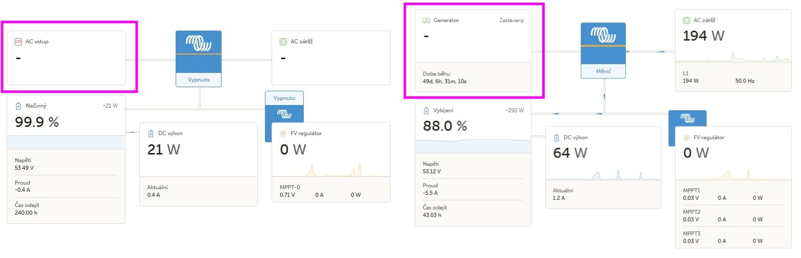 Pravý screen je ze soběstačného domu, kde AC vstup není a je nahrazen generátorem přímo vlevo nahoře, místo AC vstupu.
