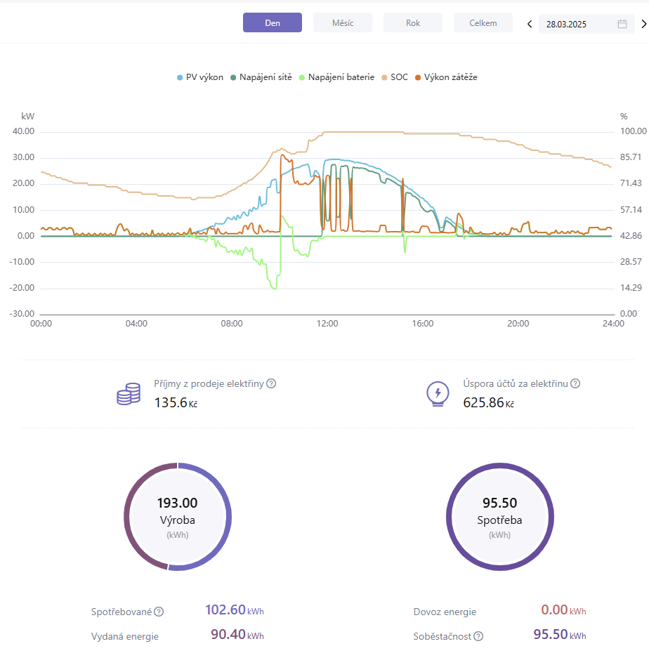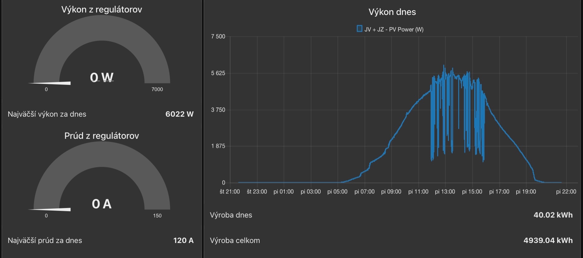 SOLINTEG MHT-50K-100, východ střecha 14,5Kwp,jižní stěna 6,3 Kwp,západ střecha 15,5Kwp, chalupa Majda 7,6 Kwp. Baterie 30 ks Pylontech H48050 72 Kw ,optimizéry Tigo.
