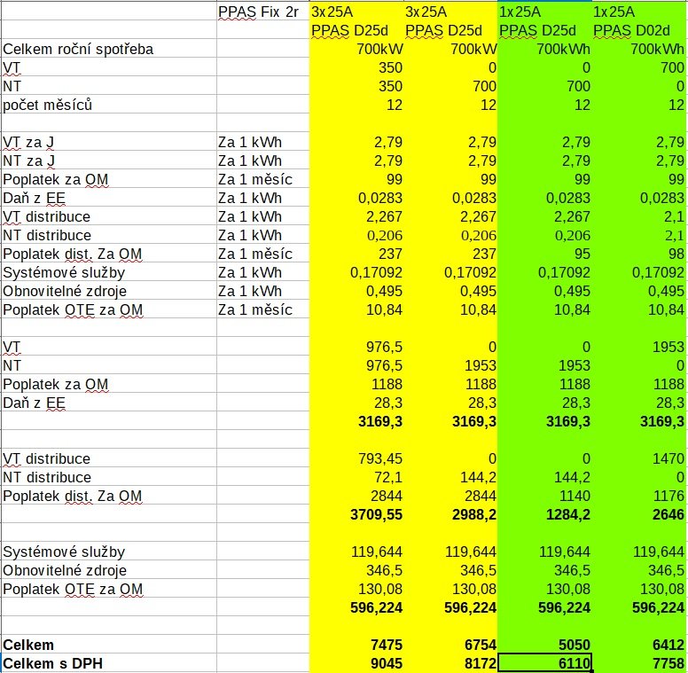 Do mé tabulky kalkulace elektřiny jsem si doplnil sloupec pro spotřebu cca 2MWh a po změně z 3f25A na 1f25A mi to nevychází vůbec špatně. Vychází mi to finančně skoro jako to dřevo. Jen nevím jestli nedělám někde ve výpočtech nebo úvahách chybu.