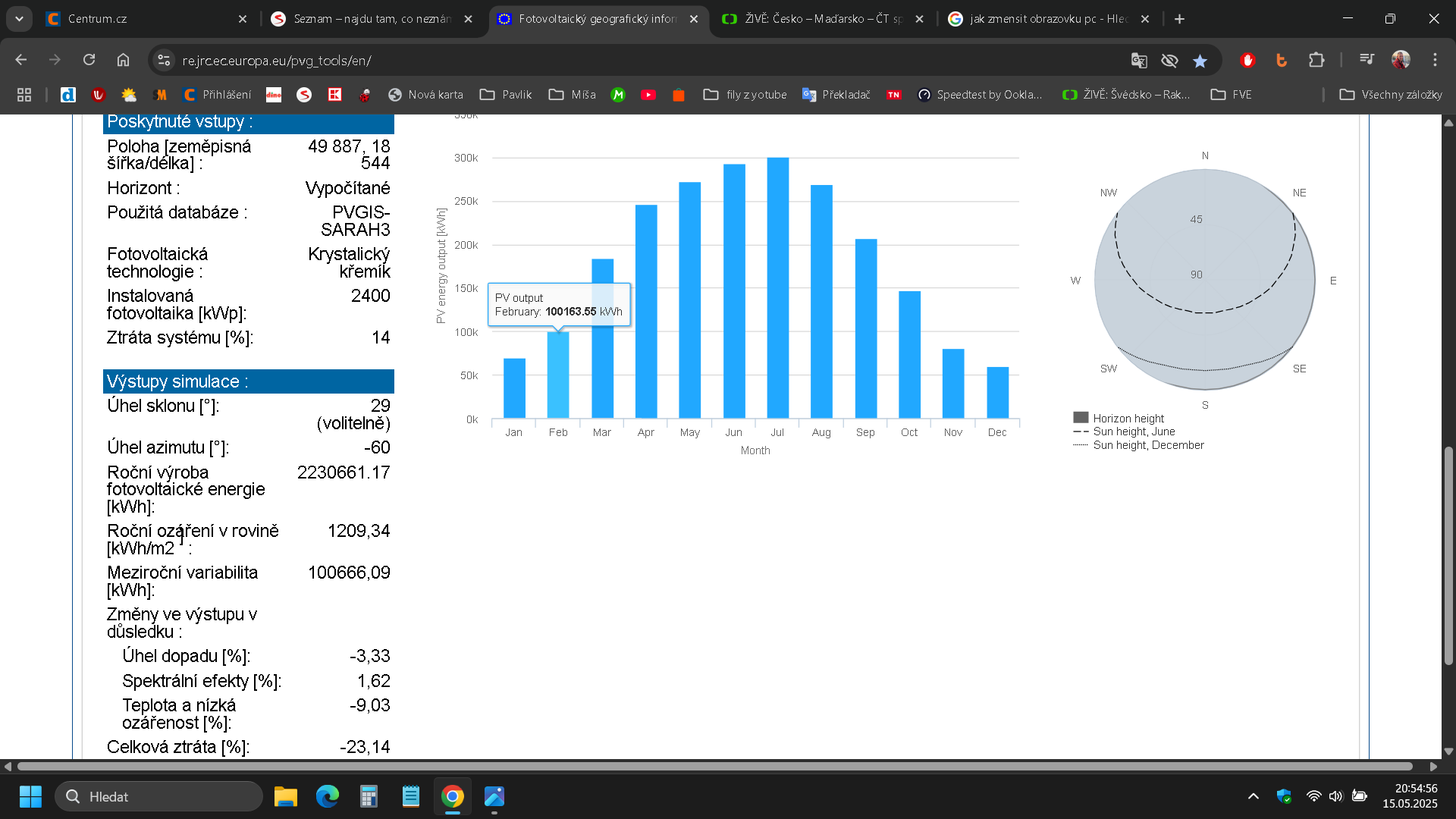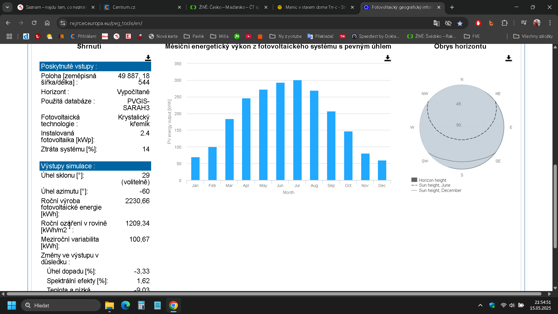 2kWp mám na jihu asi 2,2MWh/rok, pokud jste na severu a na severní stráni, asi bych typoval okolo té roční spotřeby domu. Např. na Vysočině zase víc svítí a my tu máme inverzi.Pavel66 píše: čtv kvě 15, 2025 5:23 pmDik za odkaz, Prosimte potreboval bych poradit. Je tam vic moznosti.Pro mou potrebu vypoctuSoban píše: stř kvě 14, 2025 11:11 pmTa pořád existuje https://re.jrc.ec.europa.eu/pvg_tools/en/