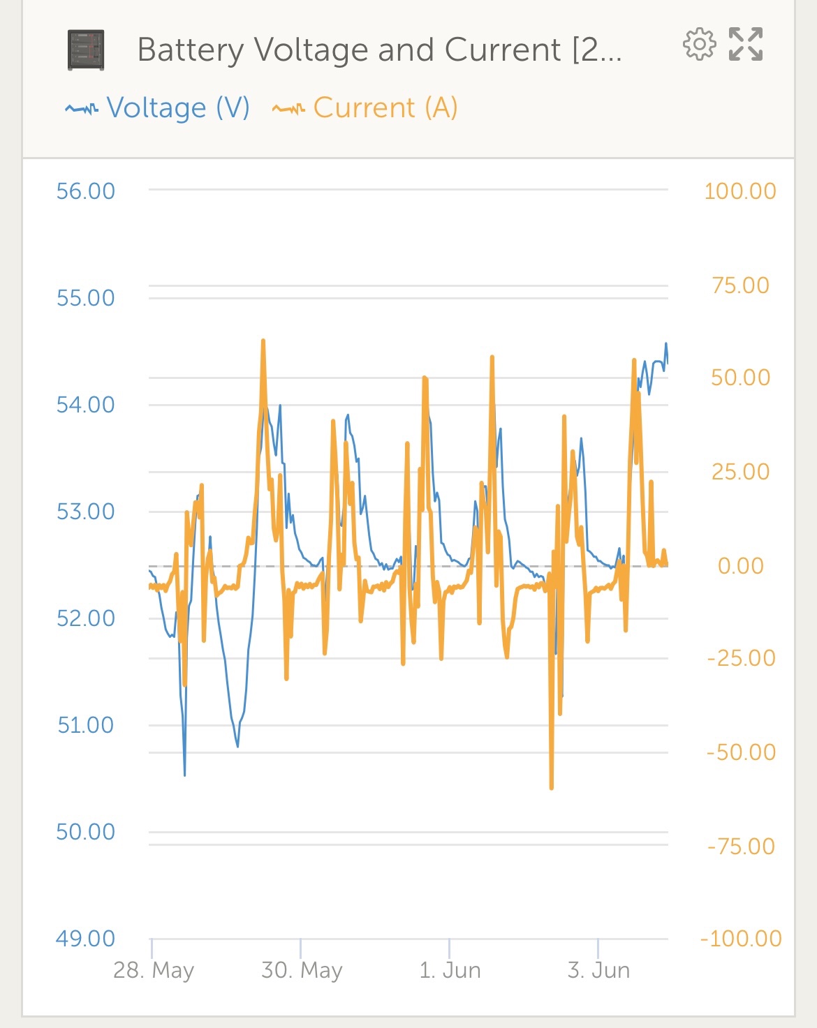 No naopak, a není to nabíjení a vybíjení spíš nějak utlumený? Jsou 100A regulátory a víc jak cca 40A nahoru dolů 30A ta baterie podle těch grafů neviděla. Takové divné peaky to jsou. Co ty špičky představují za spotřebu?