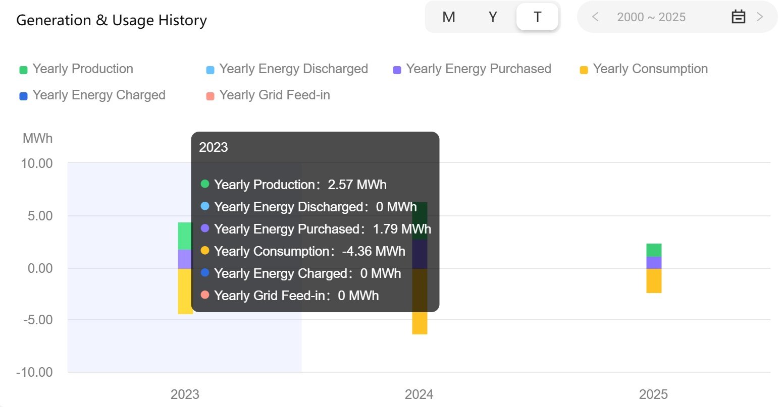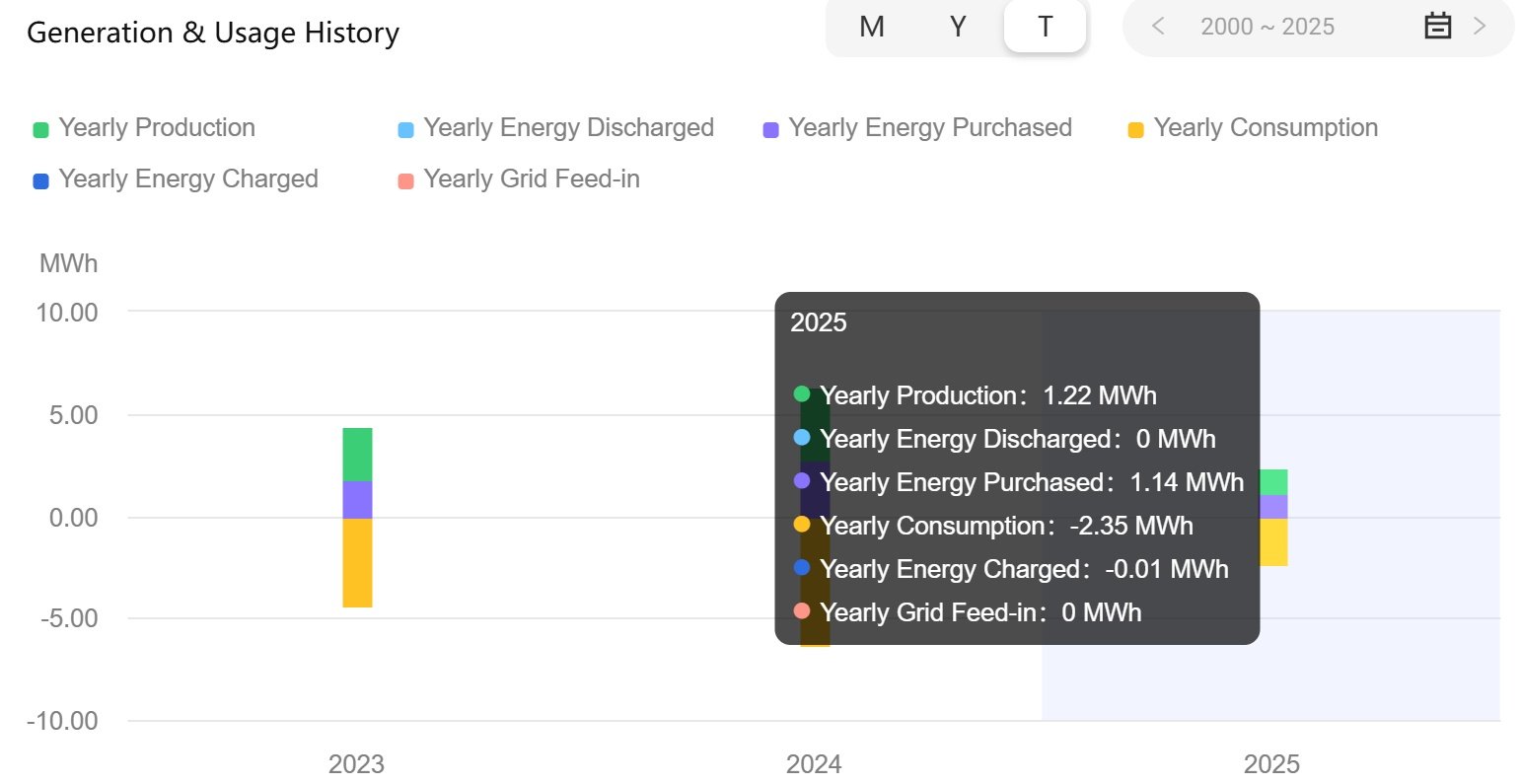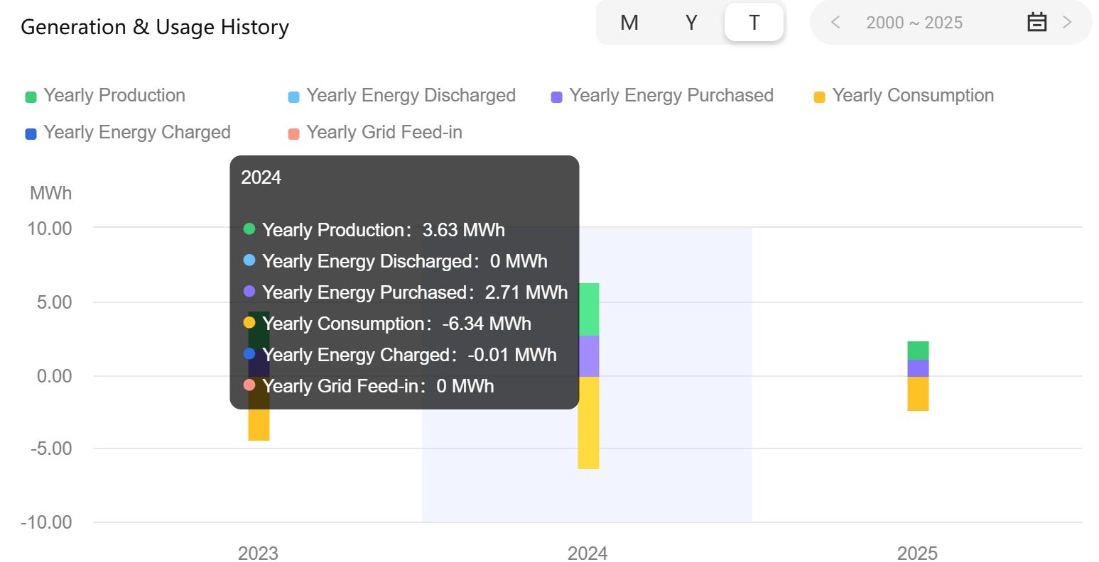 Přes střídače generováno za celou dobu provozu 7.42MWh, viz příloha z Deye Cloud.