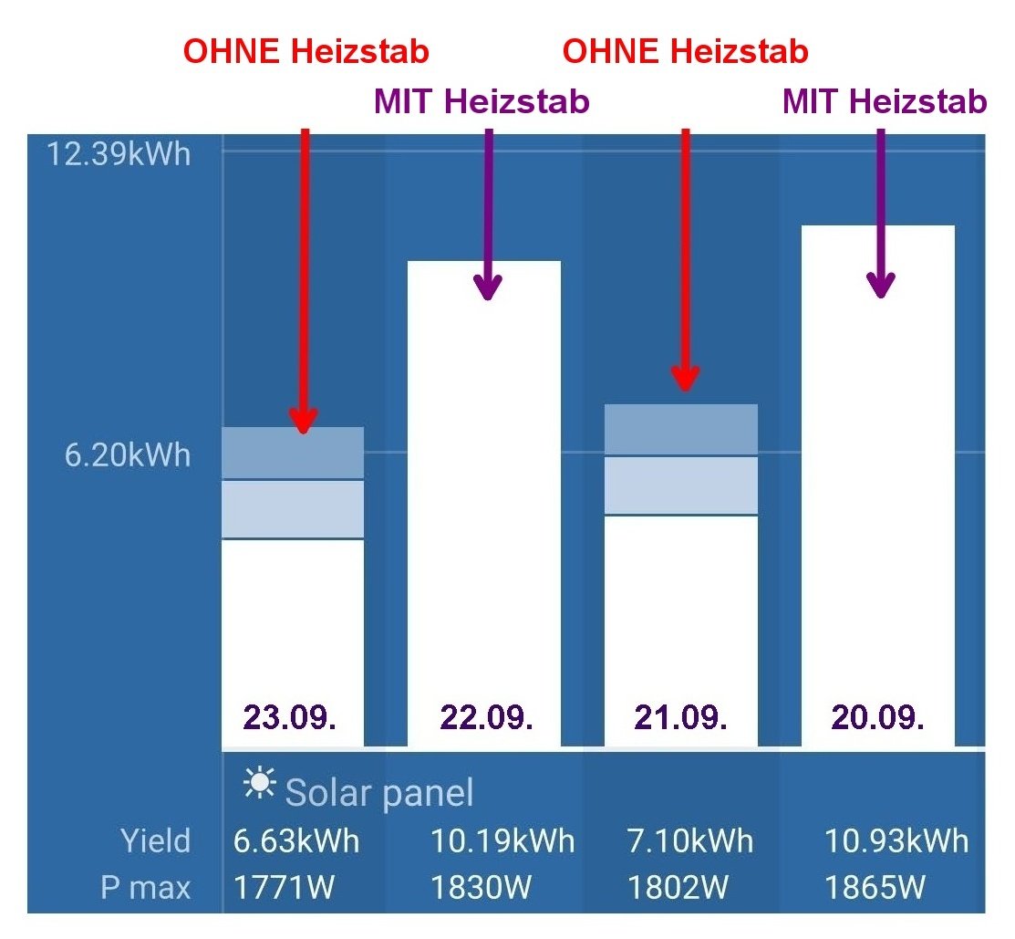Na konci dne byla baterie úplně stejně plná, jak se spirálou, tak i bez - ALE zisk úplně jiný na jednom 2,25kWp stringu.