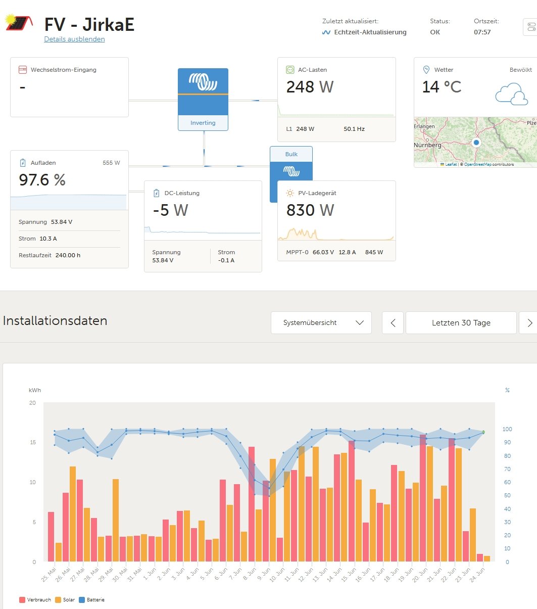 9,2kWp JV 45°, 4,6kWp JZ 45°, 2,3kWp JV 90°, 2 x Victron MP II 5kVA, 3 x SmartSolar 150/70, Smartshunt, Cerbo, 16x280Ah + 16X300Ah + 16x300Ah LiFePO4 + 3xJK BMS.