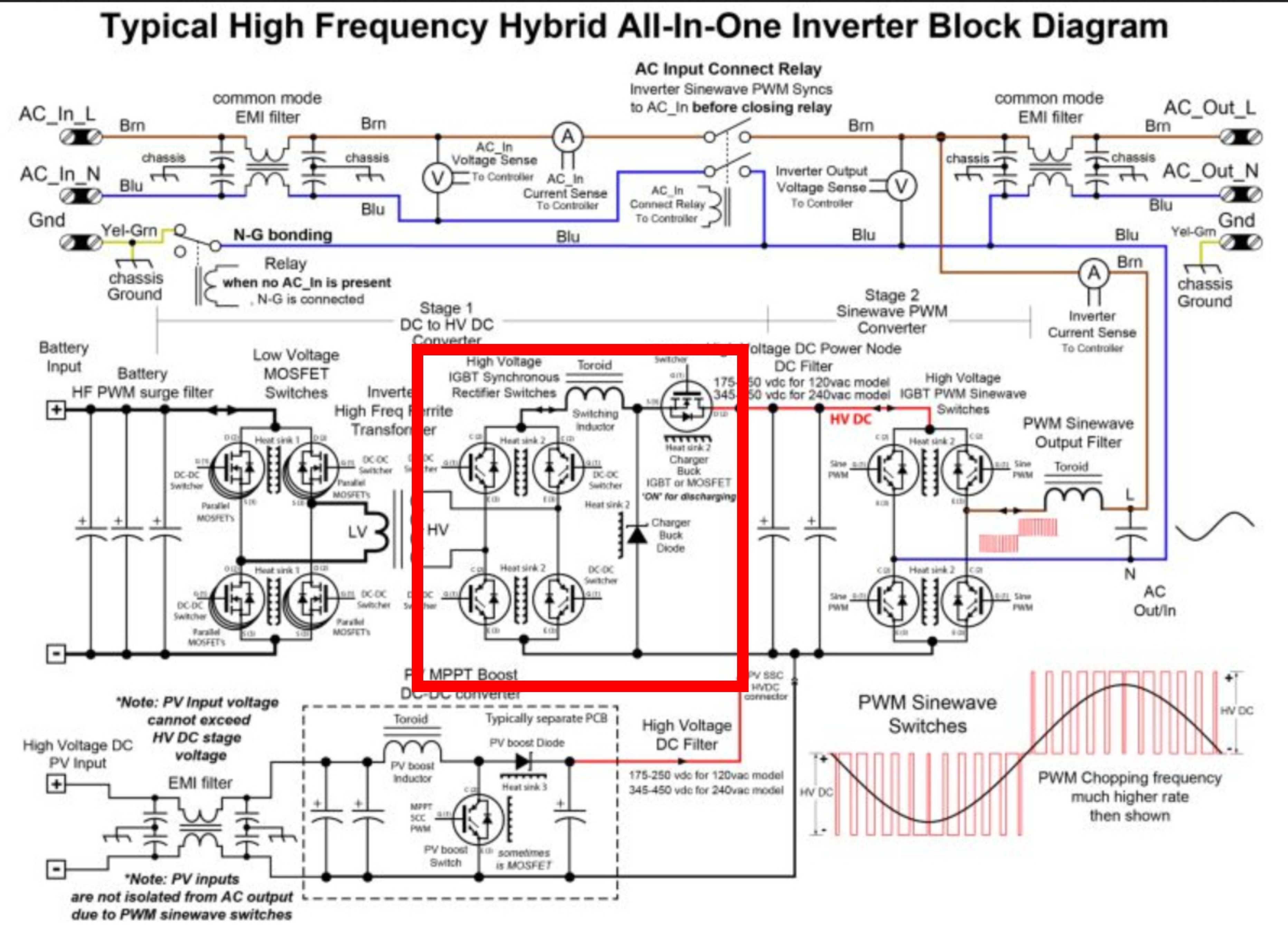 Je to neřízený DC/DC měnič, všechny tranzistory okolo toho transformátoru (MOSFETy na straně baterie a IGBT na straně sběrnice) jsou ovládané jedním SG3525 s konstantní frekvencí i střídou. Udržuje konstatní poměr napětí mezi baterií a "vyskonapěťovou" stranou, bývá to 1:8, vyjímečně 1:7. Dá se to chápat tak, že vždycky jedna strana je střídač a druhá usměrňovač, ale když se to otočí, elektronicky se tam nic nepřepíná, tranzistory jsou buzené pořád stejně, jen proud teče opačným směrem. Jediné, co procesor ovládá, je ten "nabíjecí" IGBT.