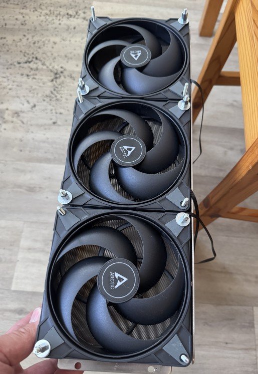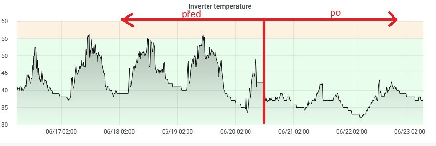 Uživatel přidal tři ventilátory ARCTIC P14 Max 14x14 cm na vršek střídače Axpert MAX E 48V 11000W spolu s prachovými filtry před i za ventilátory. Ventilátory jsou řízeny regulací teploty z Aliexpressu, která zvyšuje otáčky při teplotě nad 40 °C a snižuje je na minimum při nižších teplotách. Díky tomuto vylepšení klesla provozní teplota střídače z původních 57 (64) °C na 43 °C, což přispívá k lepší spolehlivosti a výkonu zařízení.