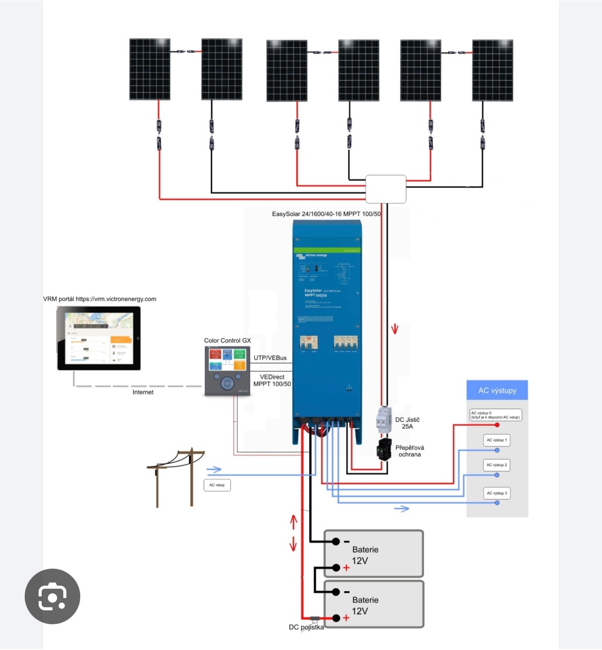 ostrov skoro 8kWp neustále ve stádiu zrodu: smartshunt(ex WBJR), MPPT150/45, MPPT 250/100(ex midnitesolar 150 clasic lite), 16S a různě P cca 340Ah Winston, MP II 5000,( ex Powerjack 8kW, ex samodomo cca 4kW). 48V DC rozvody a spotřebiče.