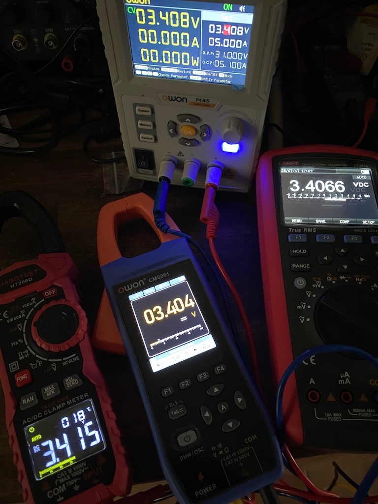 Mimochodem, tady je hezky vidět ta přesnost, typicky při měření LiFePo článků. HT208D chyba +9 mV, CMS061 chyba -2 mV, panel zdroje P4305 +1 mV.