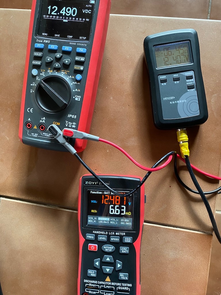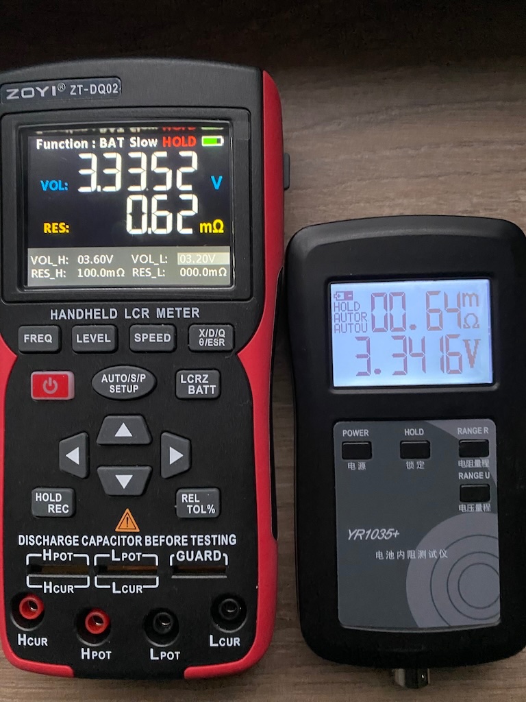 Tak, začněme pozitivy. Napětí měří výrazně přesněji než YR-1035+ (multimetr na fotkách si dovoluji považovat za přesný na stovky μV v tomhle rozsahu, napětí změřené ZT-DQ02 se tomu relativně blíží), který je blbě o asi 6mV u napětí kolem 3.4 V a dokonce o >80 mV u napětí cca 12.5 V. ZT-DQ02 je možné z menu poměrně snadno zkalibrovat, civilizovaně mu upgradovat firmware přes USB flashku apod. Uživatelský komfort je nesrovnatelný, displej čitelný, není potřeba podsvětlení, které se na YR-1035+ pořád vypíná atd. Není to jednoúčelový přístroj, pořád je tam ještě ten LCR můstek, kterým můžete měřit impedanci, reaktanci, kapacitanci, ESR... Čtyřpinový konektor je shodný na obou měřácích, v obou případech probíhá měření Kelvinovou metodou a sondy lze snadno mezi oběma přístroji podle potřeby za chodu prohazovat (u 1035 jsou hroty, u Zoyi svěrky/kleštičky). Tolik k pozitivům.