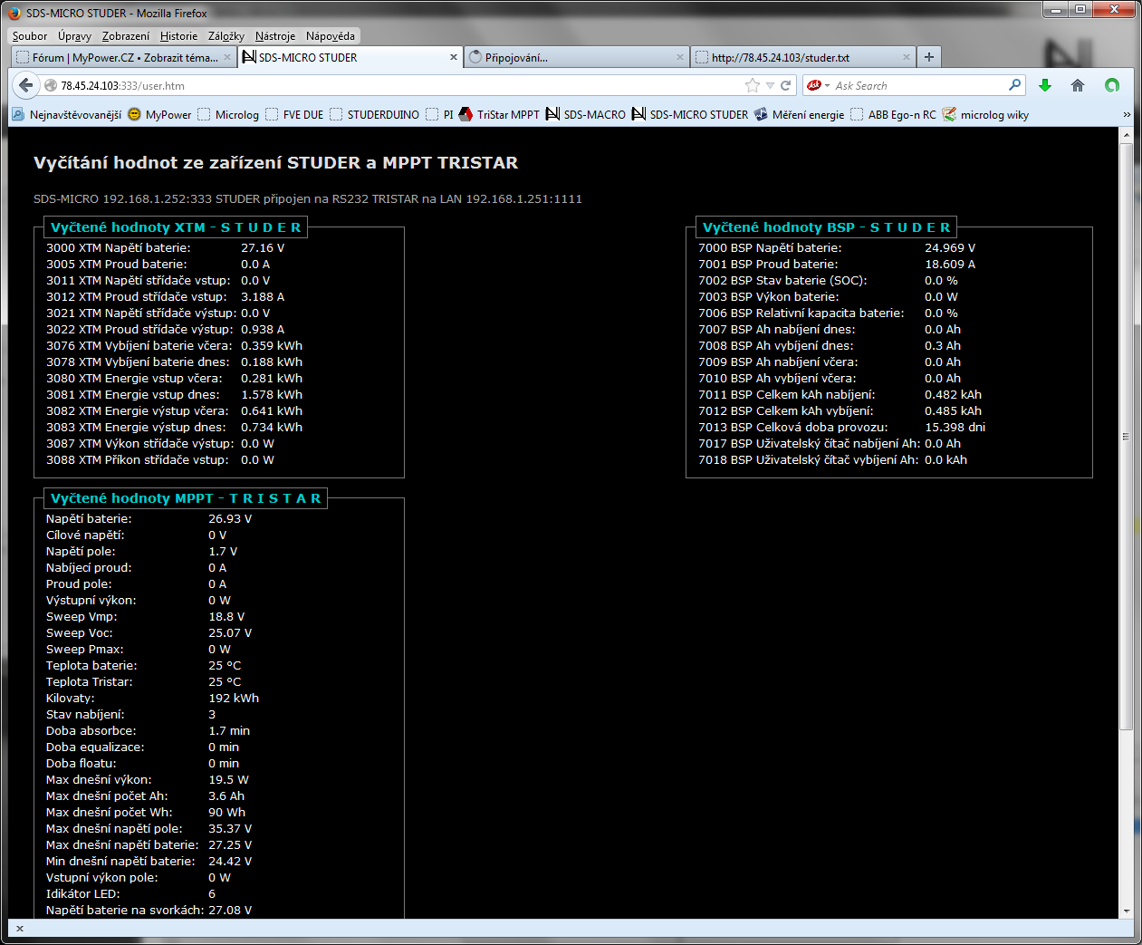 Tak jsem došel k názoru že taktéž použiju raspberry pi .Založil jsem nové téma. https://forum.mypower.cz/viewtopic.php? ... uEhb0BNxvI Myslím že by bylo dobré založit přímo samostatnou složku na Raspberry pi.Frenky píše:Mám odzkoušeno vyčítání údajů ze střídače STUDER a BSP-500 zařízením SDS-MICRO, přes rozhraní RS232, funguje to, ale RS232 na SDS není stabilní a vznikají tam nějaké chyby. Velkou částí vývoje se podílel zde na fóru "Prochazka85".
