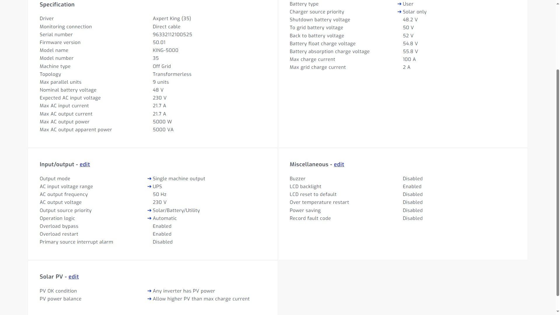 Mam sice nízkonapěťového Kinga ale nastavení mam stejné. Jen něpětí nabíjení mam níž. Ze sítě mě žádná spotřeba nejde dokud se nevybijou baterie na hodnotu kdy se spustí nabíjení ze sítě.