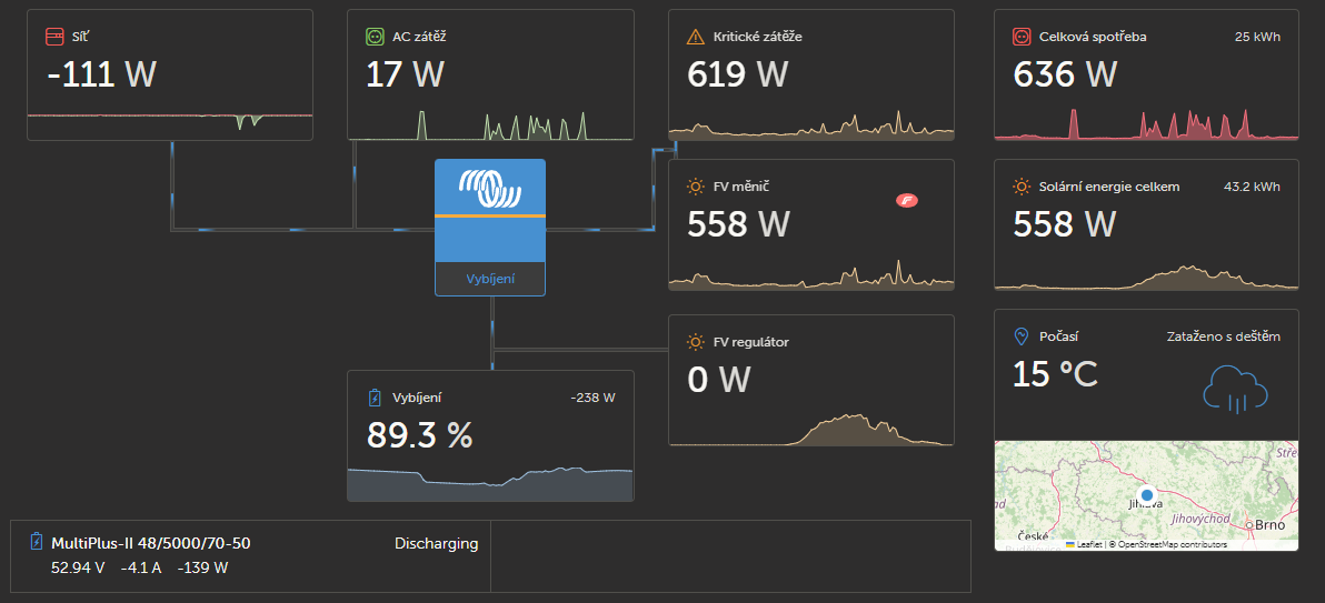 V systému Victronu je pak i přes noc fungující Fronius zobrazován jako že vyrábí ze sluníčka, protože nic netuší o tom, že Fronius má nějakou baterii, ale to je jen nepodstatný detail.