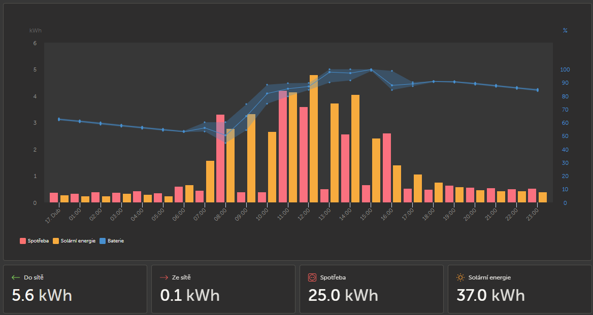 Jedinou nevýhodou je, že pokud má Victron nabité baterie, tak přebytky dává do sítě a Froniusu s jeho baterií nepomůže, protože o ní neví.