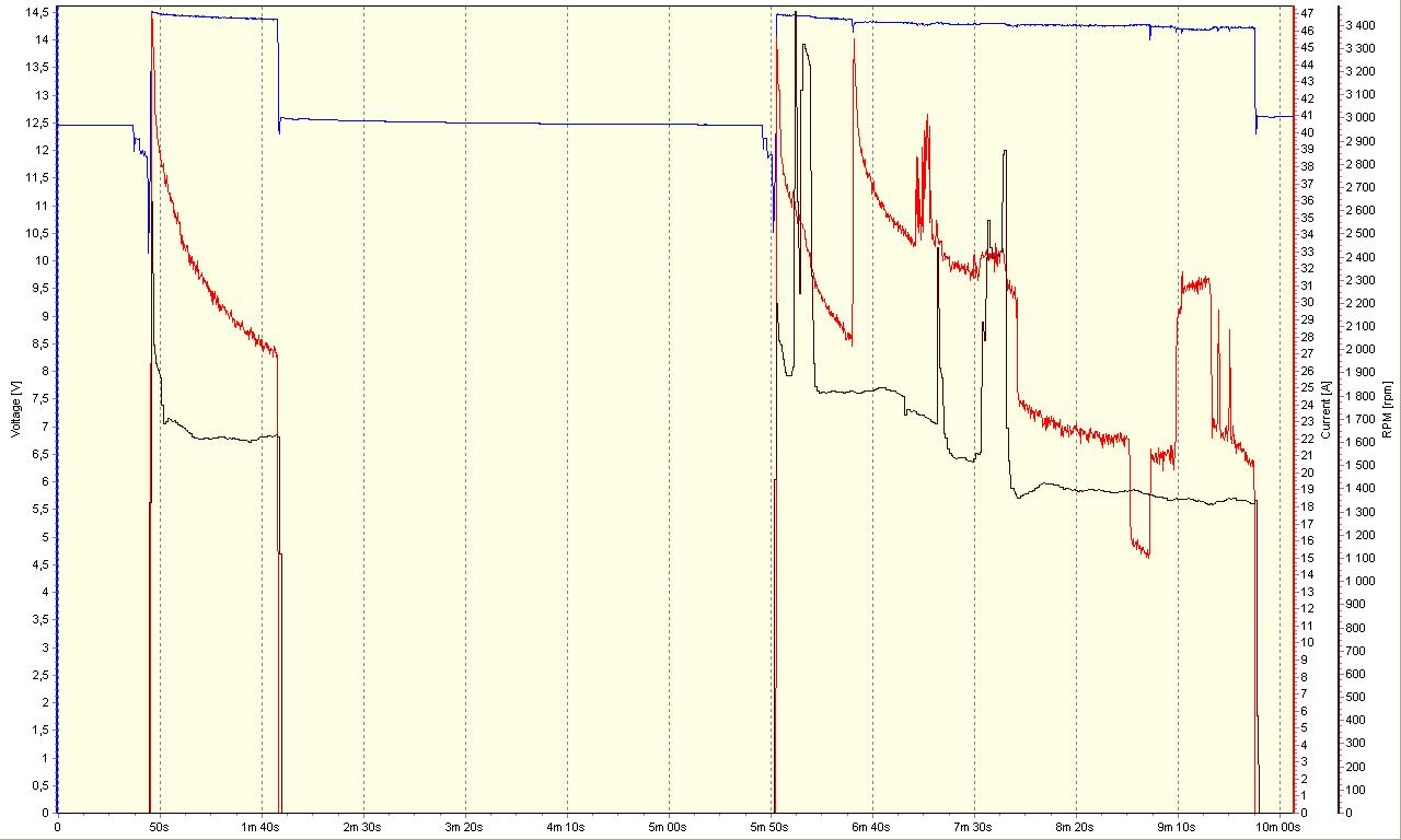 Snad jsem pochopil, a beru to od 7:30 kdy došlo k tůru a napětí bylo i nadále regulované na 14,5V a proud drobně vzrostl. Následně i při 1300 otáčkách se také projevovalo omezování napětí a tím proudu. Škoda, že nebyla měřen volnoběh.
