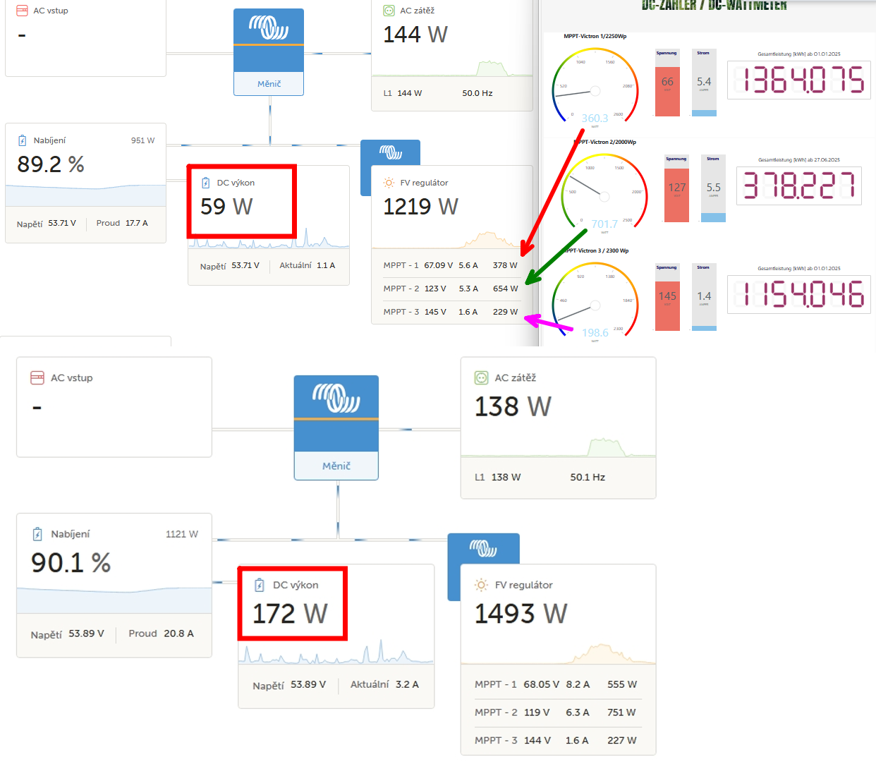 A pokud tedy ukazuje Dashboard Victron - výkon na výstupu z MPPT - již snížený o svou vlastní účinnost a ztráty - tak co ukazuje právě teď ?