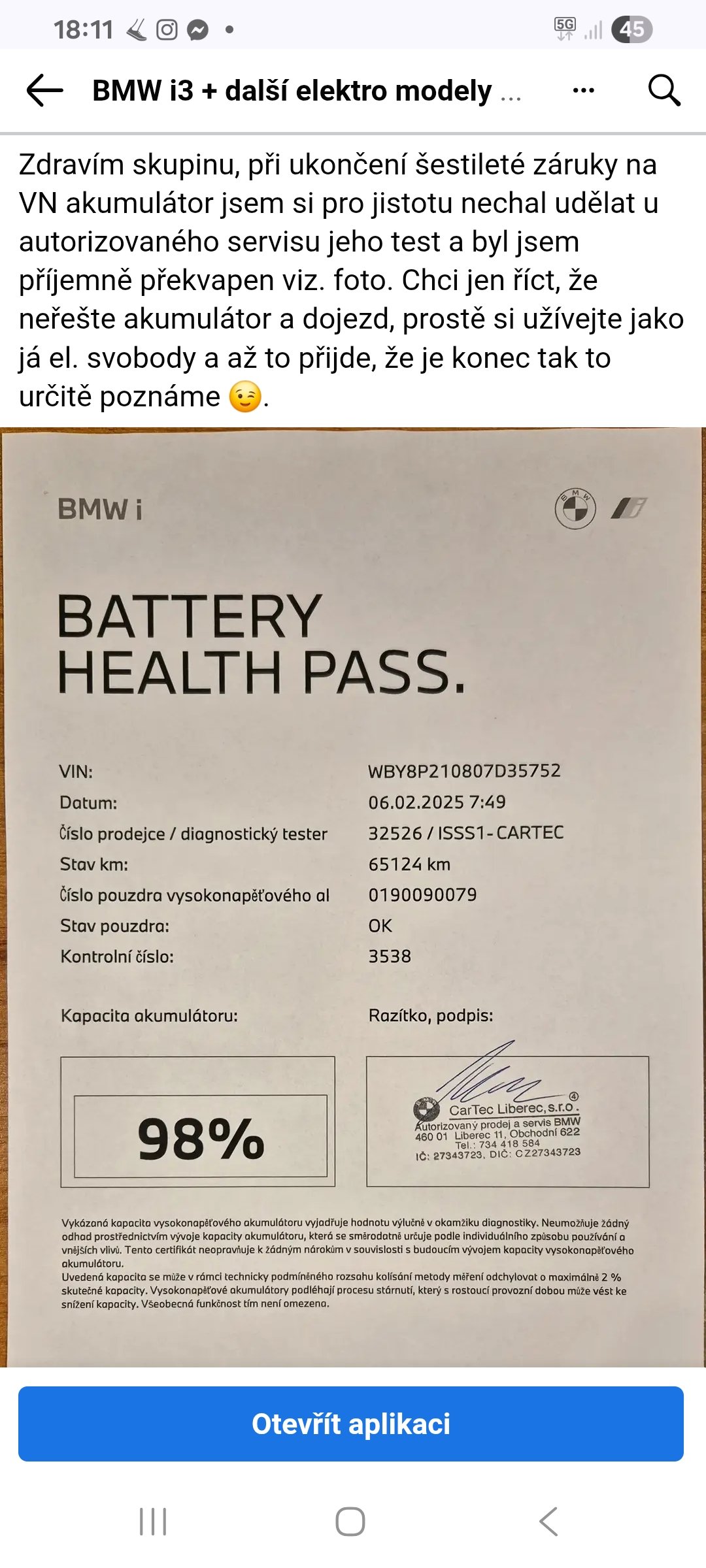 To je extremně dobrý výsledek po 6 letech, 98% kapacity - jde tomu opravdu věřit ?Franta2776 píše: sob srp 30, 2025 7:14 pmBmw i3 má ty baterky opravdu dobrý:
