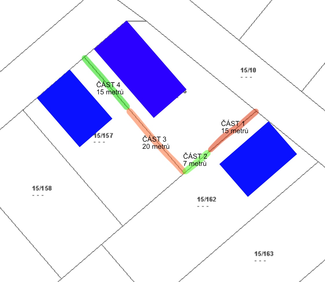 - Část 2 (stejný azimut) by pravděpodobně měla být nestíněná, takže od východu slunce až do brzkého odpoledne by měla mít slušný výkon,... ale ... je strašně krátká - očekávám, že tímto způsobem bude využitelné třeba 7-8 metrů, kdežto zbytek této části plotu spadne do části 1. A na takové délce je to tak 3, 4 nebo když pánbůh dá tak maximálně 5 ležatých panelů ve stringu, což je průšvih.