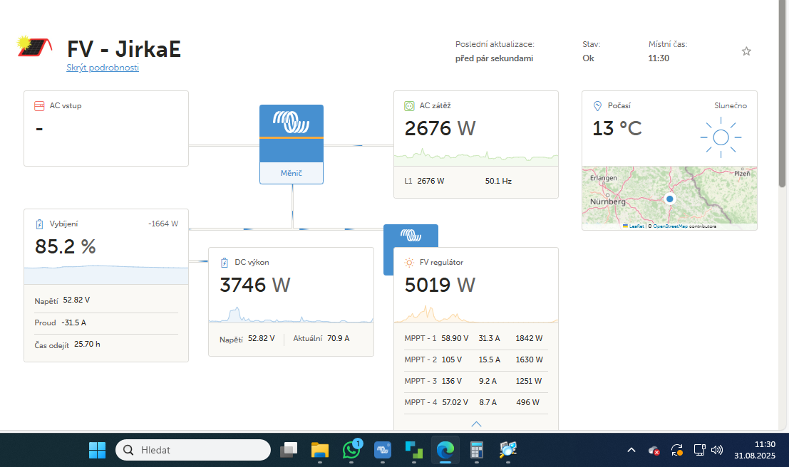2x MUST PH1800 5.5kW, 9kWp V+J+Z, 600 Ah LiFePO4 s BMS JBD 200A, SW: Home Assistant na Synology DS923+ ku tomu ESPHome, Tasmota, MariaDB, InfluxDB, Telegraf, Grafana, Zigbee2MQTT..., HW: ESPlan (ESP32 + LAN 8720 + RS485). Nejaké moje projekty: MUST-ESPhome, ELTEK Flatpack2 ESPhome, ESP32-EMON, PZEM-017@WiFi, diyBMS-CurrentShunt-ESPhome , BMS UART-TS485 adaptér