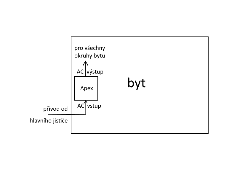 Ale vždyť už jsem to tu psal několikrát, že ten Apex má bypass přímo v sobě. Prostě ten přívod co mu jde z hlavního jističe přímo do bytové rozvodnice přeruší. Přerušenou část, která vede od hlavního jističe připojí na AC vstup Apexu. Druhou přerušenou část, která vede do bytové rozvodnice zapojí na AC výstup Apexu a je hotovo. U zásuvek ani jiných okruhů uvnitř bytu se nic měnit nebude a žádné prodlužováky po bytě k jednotlivým spotřebičům tahat nemusí. Už to chápete?