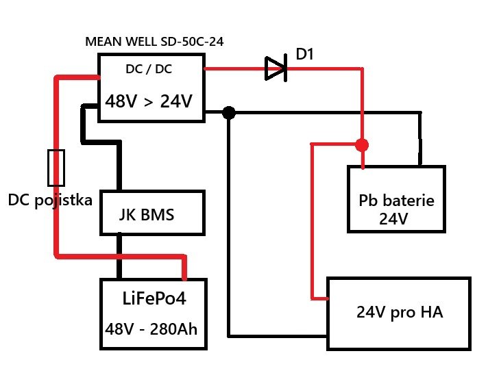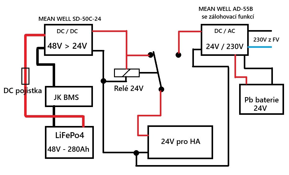 Cívka 24V relé by byla napájená přes DC/DC převodník 48V > 24V z LiFePo4 baterie a pokud by BMS odpojila vybíjecí cestu tak by relé rozeplo a povolila se cesta 24V z AC/DC zdroje, který by byl zalohovaný Pb baterií. Mínus poly obou MEAN WELL zdrojů na výstupu 24V bych spojil, tak si nejsem jistý jestli by toto spojení těm MEAN WELL zdrojům nějak neškodilo???