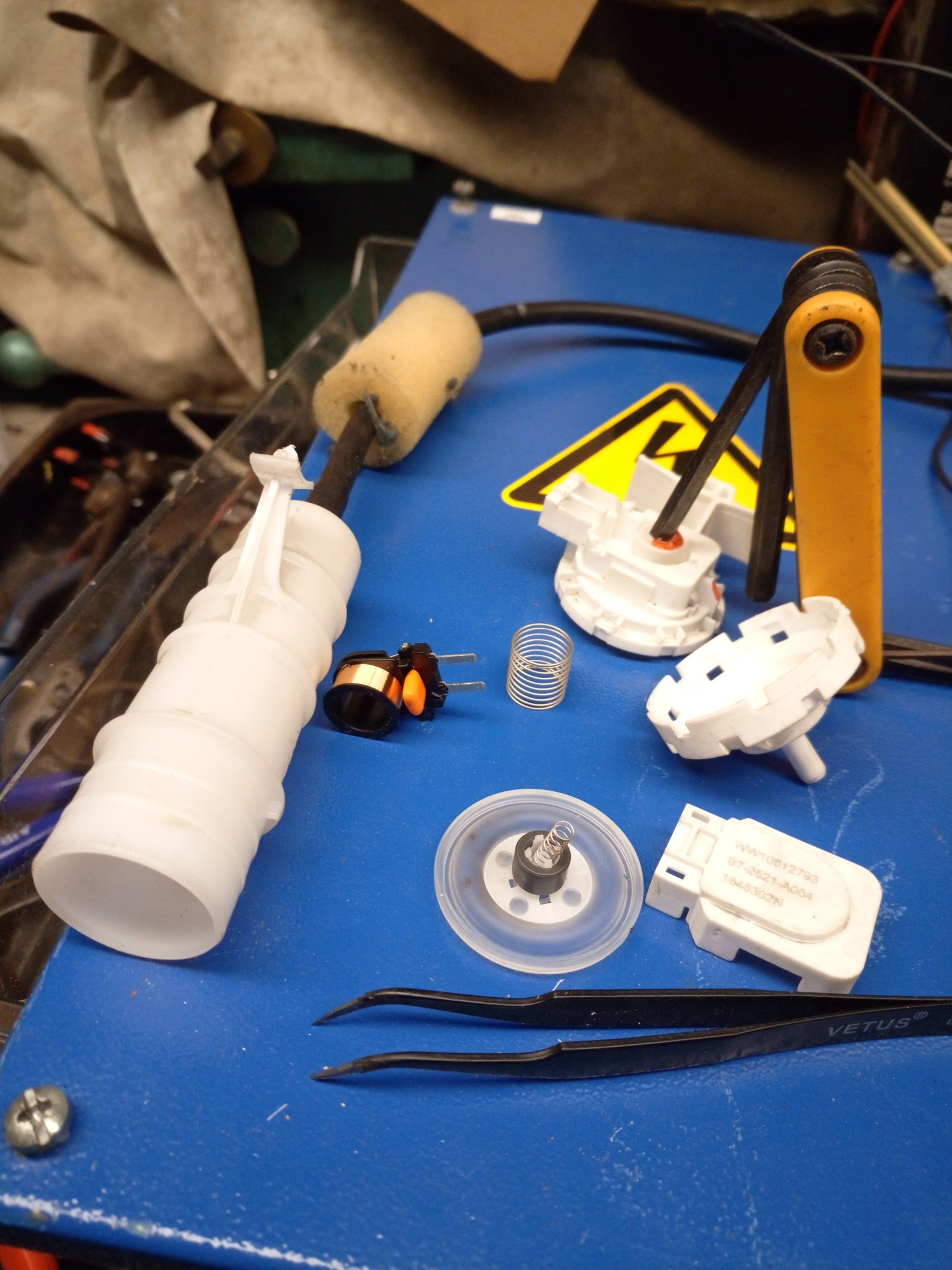 V diskuzi se řeší princip fungování hladinových spínačů z praček, zejména měření jejich parametrů pomocí LCR metru a možnosti využití AD převodníku pro vyhodnocení změn indukčnosti a odporu. Uživatelé diskutují o jednoduchých mechanických spínačích versus analogových senzorech a navrhují řešení s magnetem a jazýčkovým kontaktem pro spolehlivější detekci hladiny vody. Zmiňuje se také možnost využití rezonančního obvodu a jednoduchého relé pro ovládání přívodu vody.