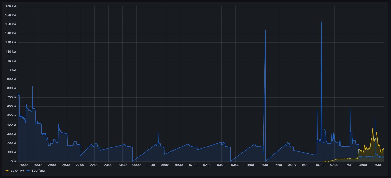 Tak ako som ti vravel...v noci je vsetko vypnute (tak sme nauceny) a ide len router chladnicka a mrazaky, samozrejme nabijanie telefonov...Nemame ziadny pc ani server ani nic podobne.Mame tri notbuky ktore sa mozu nabit ked svieti..