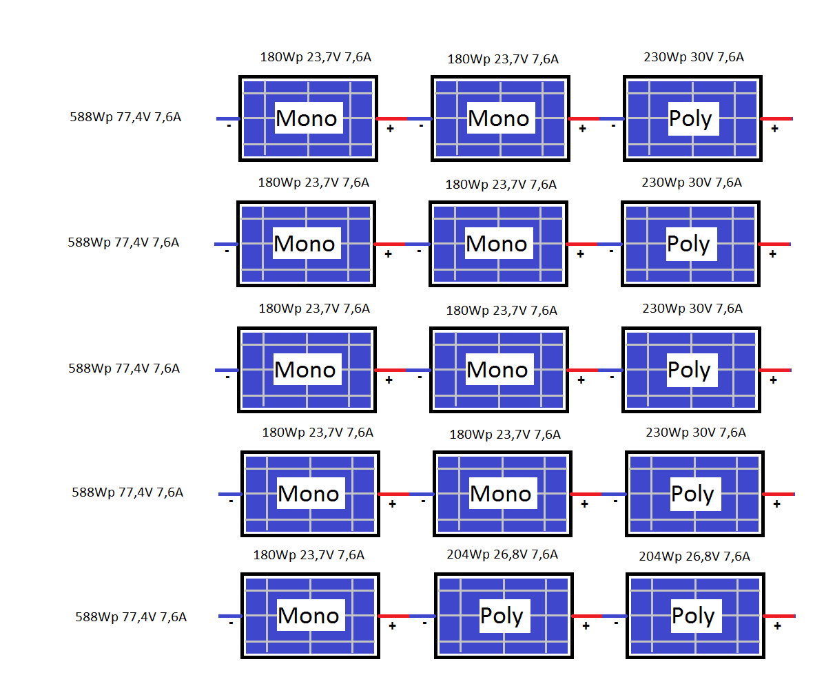 Zrovna se ti sešly panely s téměř stejnou charakteristikou článků. 230Wp kousky můžou mít parametry odhadem Ump 30V Imp 7,6A, tím pádem je proud totožný jak pro mono tak pro poly a lze je zapojit do serie podle obrázku téměř bez ztráty výkonu.