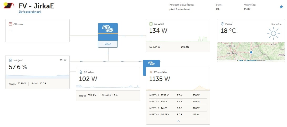 Jasné přes mppt victron jde jenom 25% panelů.Jinak je v systému Max 7200+easun5500 a oba jsou plnĕ panely obsazeny.Až umřou, tak je nahradim.snad Victronem.Celkový špičkový nabijeci proud je až 240A.