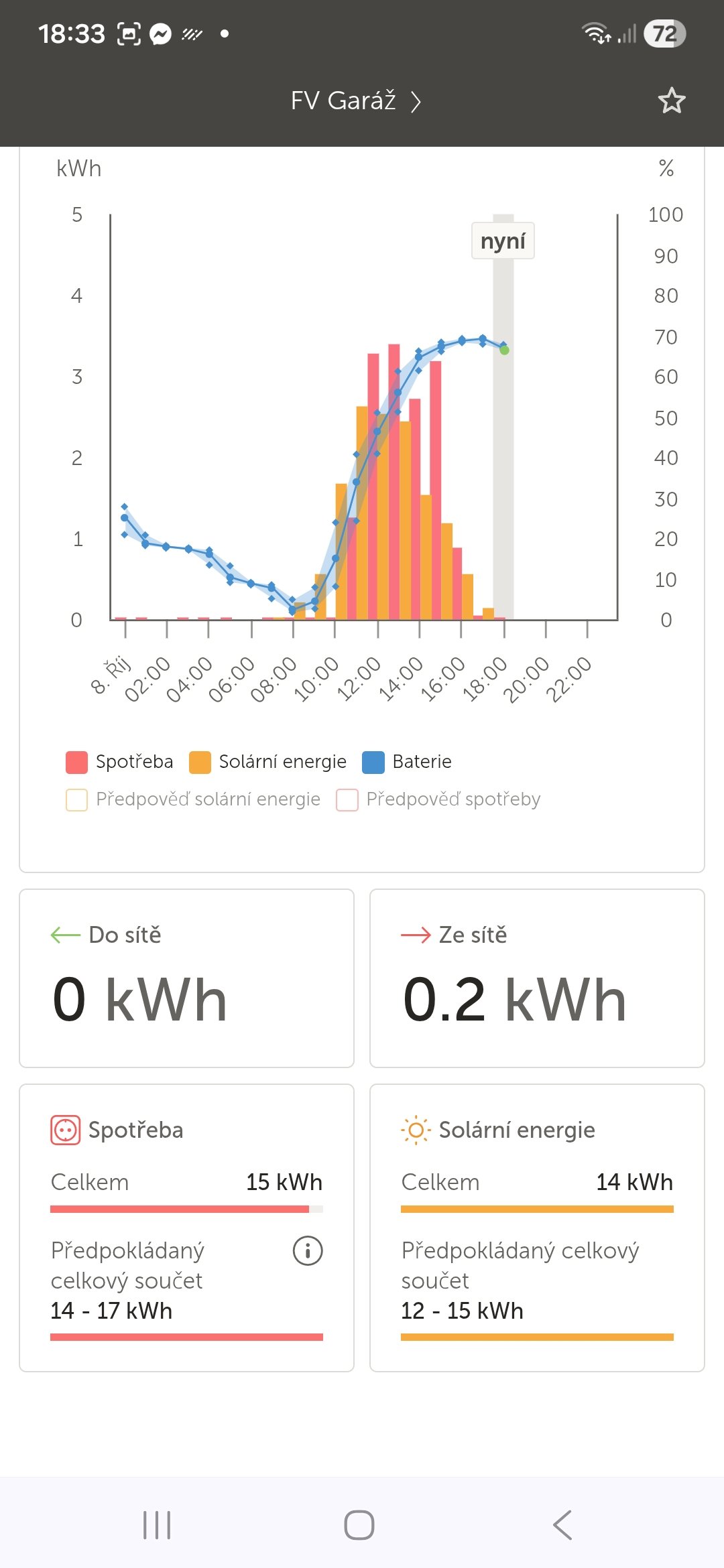 5,4 kWp JJZ 4deg,1,8kWp JV 24deg, do 13.8.2022 bylo 3,6 kWp, MPII 5k, Victron MPPT 250/85-TR, aku 9,45 kWh Lion 15S, BMS 200A, Smart Shunt 500A.
