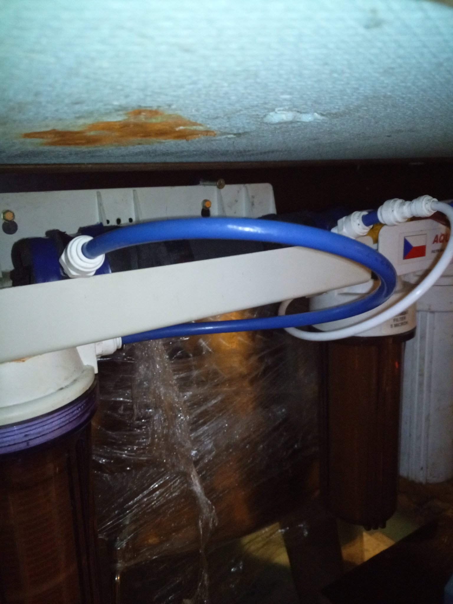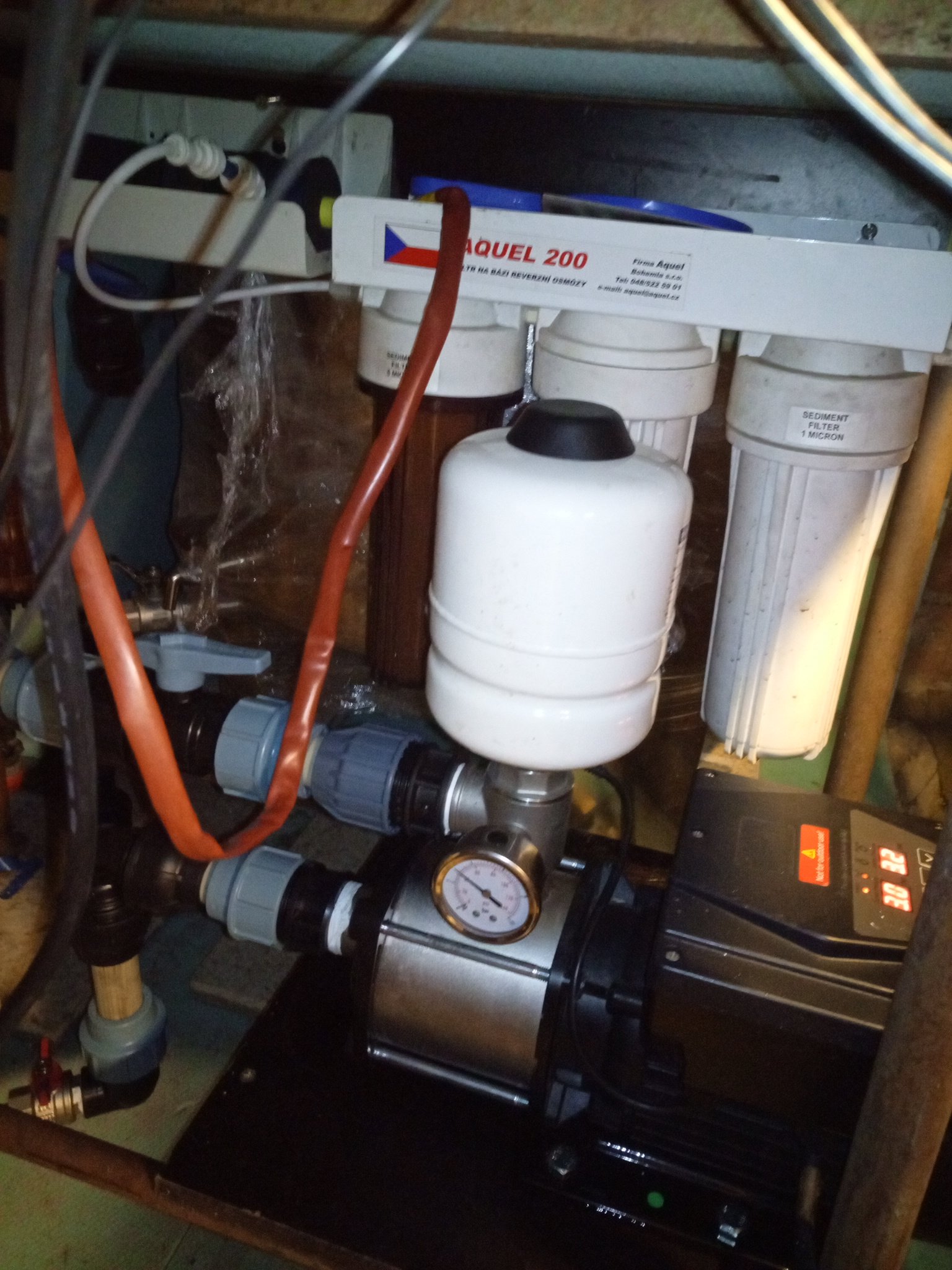 Stačí když trochu kape, tak nakape i na spotřebu domu.Horní delk, trochu se práší, ale ne do vody.Ohříváček v černém uteplení mezi filtry, má nerez topidlo, je to nález z příhřevu pro dializační přístroj, takže chirurgická kvalita oceli.Ta červená bužírka jde k příhřevu, dále je tu vodárna s FM a nějaký stolek který bude ale jinak, vše bude mobilní tz vše bude na sekce v bednách pro rozváděče, kterých se mi zadařilo nalíhnout v dostatečném množství pro tuto vodní akci.A nakonec vrabčí hnízdo, které obsahuje napájení čerpadla malého před RO a nějakou vypínací automatiku.