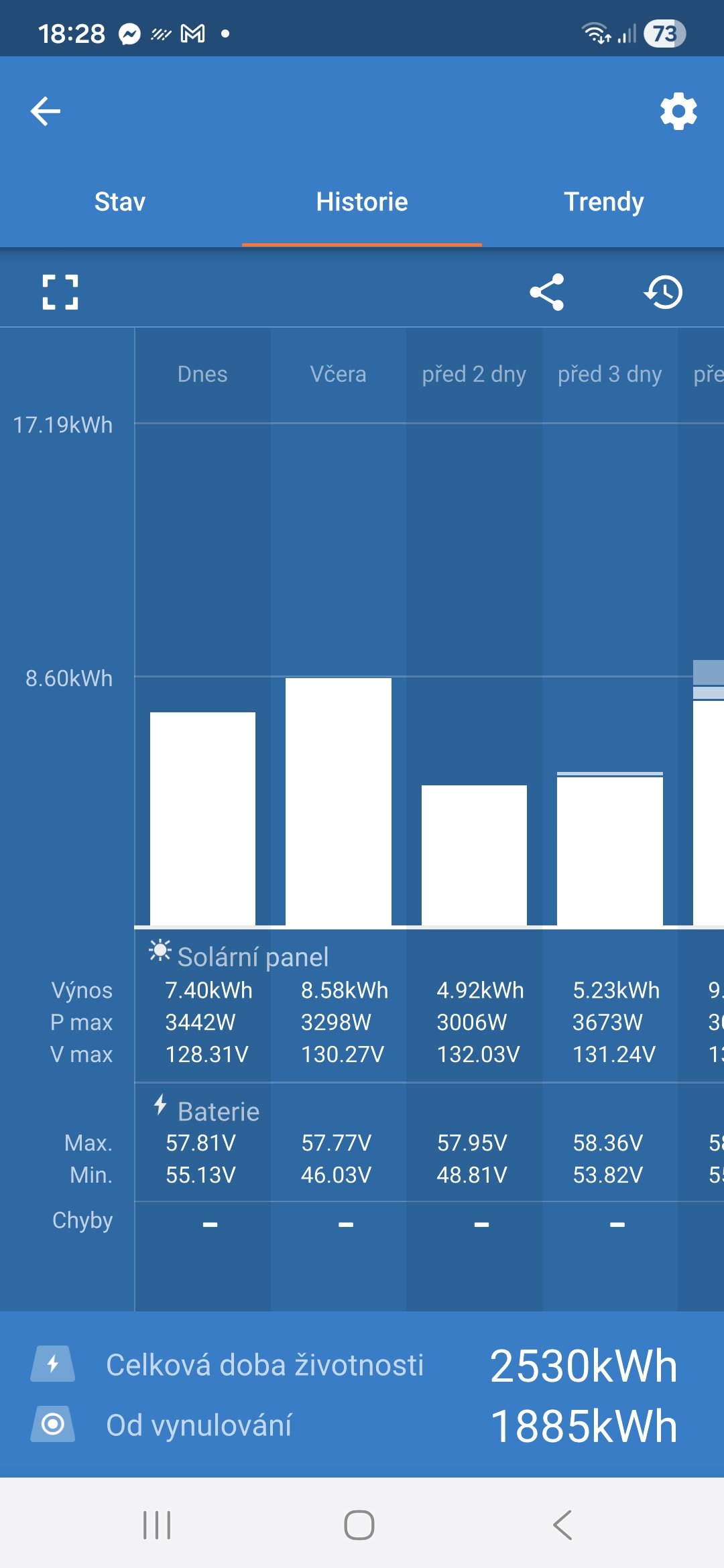 5,4 kWp JJZ 4deg,1,8kWp JV 24deg, do 13.8.2022 bylo 3,6 kWp, MPII 5k, Victron MPPT 250/85-TR, aku 9,45 kWh Lion 15S, BMS 200A, Smart Shunt 500A.