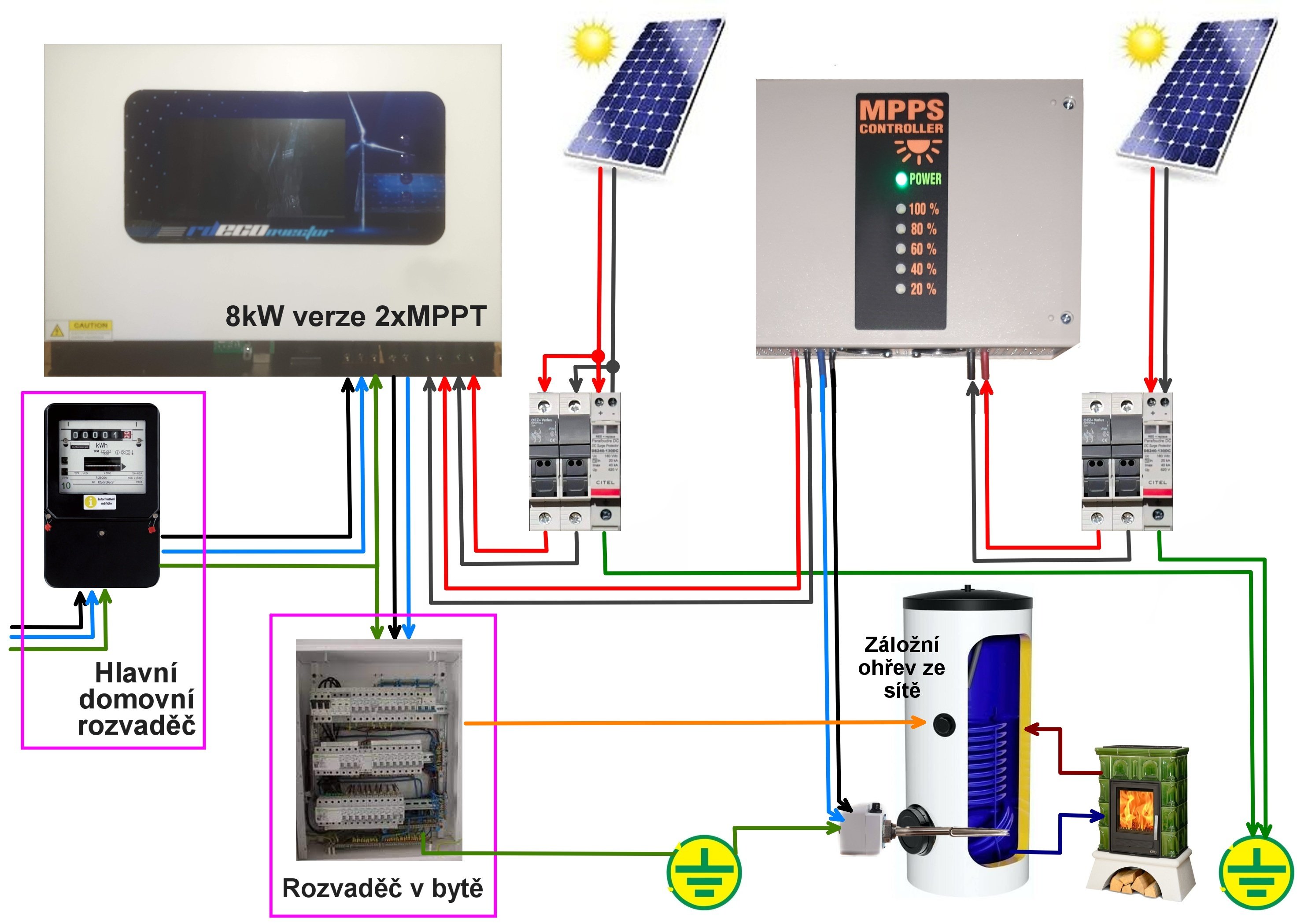 Idea je ta, že jeden String valí non-stop do domácí sítě, druhý do vody, když se voda ohřeje, nebo sepne něco většího (třeba nad 8A) , připne se i druhý string do domácí sítě hned.