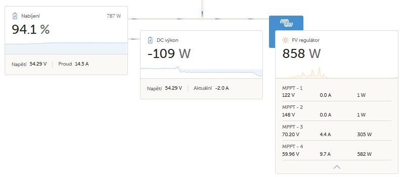 Všechna 4 MPPT - opět hromadně - přešli do bulk a nabijí naplno = nejméně jeden problém je asi vyřešen :D